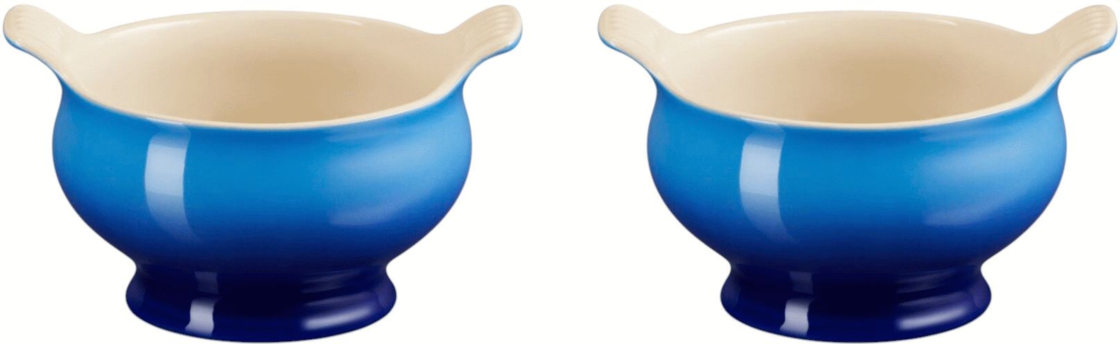 Le Creuset Heritage suppeskålsæt kombinerer traditionelt fransk håndværk med moderne funktionalitet og bringer elegance til dit spisebord. Dette sæt med to suppeskåle i den smukke Azure-farve er designet til at servere alt fra dampende løgsupper til hjemmelavede gryderetter med stil og præcision.Skålene er fremstillet i Le Creusets karakteristiske stentøj, som er kendt for sin exceptionelle holdbarhed og varmebevarende egenskaber. Materialet sikrer, at dine retter holder temperaturen længere og giver dig mulighed for at servere mad, der forbliver varm gennem hele måltidet. Med en diameter på 11 cm er skålene perfekt dimensioneret til individuelle portioner og passer ideelt til både hverdagsmåltider og mere festlige lejligheder.
