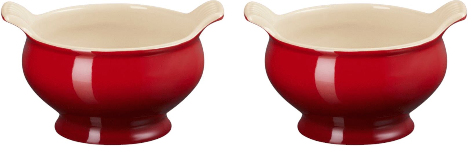 Le Creuset Heritage suppeskålssæt kombinerer traditionel fransk håndværk med moderne funktionalitet i et elegant design, der bringer autentisk bistro-stemning til dit køkken. Dette sæt med to suppeskåle i den smukke Cerise-farve er fremstillet i robust stentøj, der sikrer optimal varmefordeling og holder dine retter varme længere tid.Det kraftige stentøjsmateriale gør skålene perfekte til både servering og tilberedning. Du kan trygt placere dem direkte i ovnen for at kreere klassiske retter som fransk løgsuppe med gratineret ost på toppen. Materialets naturlige egenskaber bevarer varmen effektivt, så dine gæster kan nyde deres suppe eller gryderetter i den rigtige temperatur gennem hele måltidet.