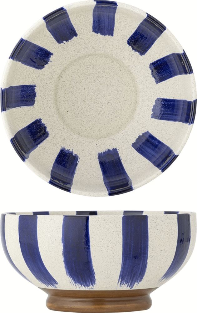 Skålen er håndmalet med omhu, hvilket skaber et unikt udtryk i hver eneste skål. De bløde blå nuancer danser over en beige bund, hvor lodrette striber og synlige penselstrøg fortæller historien om det håndværk, der ligger bag. Indvendigt fortsætter designet med et strålemønster, der giver skålen dybde og karakter. Den varme, brune fod skaber en elegant kontrast til de køligere toner og afslutter designet med en jordnær balance.