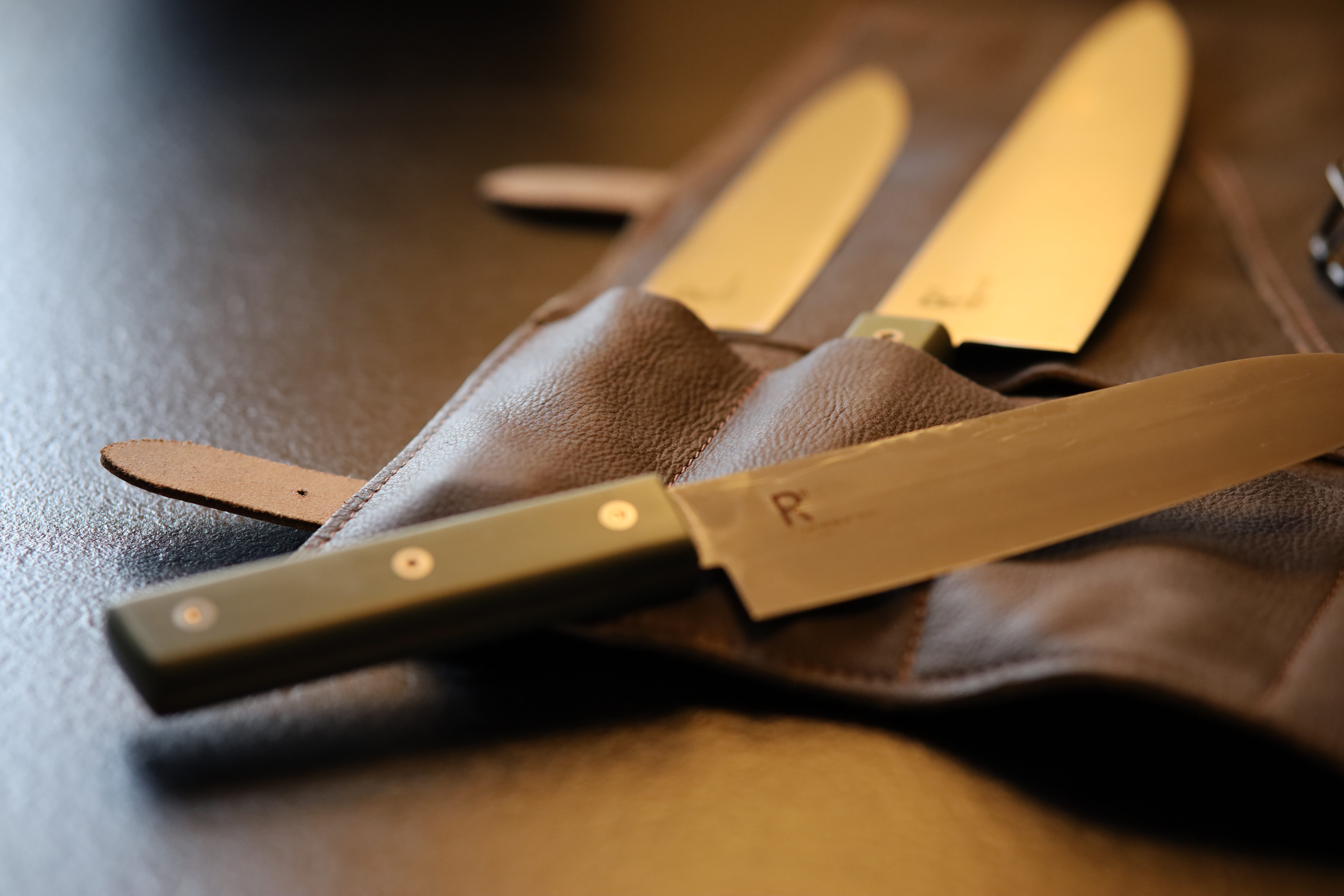- Kraftige læderremme der holder knivene sikkert på plads