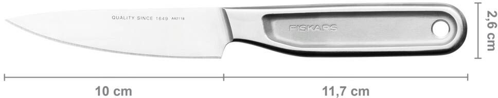 Fiskars All Steel Grøntsagskniv med 10 cm blad er en tidløs køkkenhjælper fremstillet af den fineste kvalitet rustfrit stål. Denne kompakte kniv kombinerer finsk designtradition med japansk stålteknologi for at skabe et redskab, der både er funktionelt og æstetisk tiltalende i ethvert køkken.Det helstøbte design i rustfrit stål giver kniven et elegant og minimalistisk udtryk, mens det japanske stål med højt kulstofindhold sikrer exceptionel holdbarhed og skarphed. Med en samlet længde på 21,7 cm er denne grøntsagskniv perfekt dimensioneret til præcisionsarbejde med frugt og grøntsager.