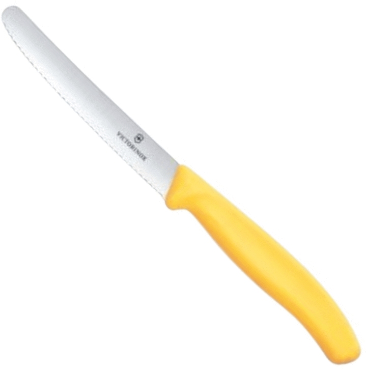 Victorinox SwissClassic Tomatkniv med orange håndtag er et præcisionsinstrument til dit køkken. Denne 11 cm specialkniv er designet specifikt til at håndtere tomater og grøntsager med perfekt præcision. Den schweiziske kvalitet skinner igennem i hvert eneste snit, hvor knivens skarpe, takkede æg glider ubesværet gennem selv de mest modne tomater uden at mase dem.Kniven er fremstillet af Victorinox' særlige stållegering, der kombinerer det bedste fra kulstofstål og rustfrit stål. Denne unikke sammensætning sikrer en exceptionel skarphed, der holder sig længe, selv ved daglig brug. Det ergonomiske orange håndtag giver ikke blot et farverigt indslag i køkkenet, men også et sikkert greb under arbejdet.