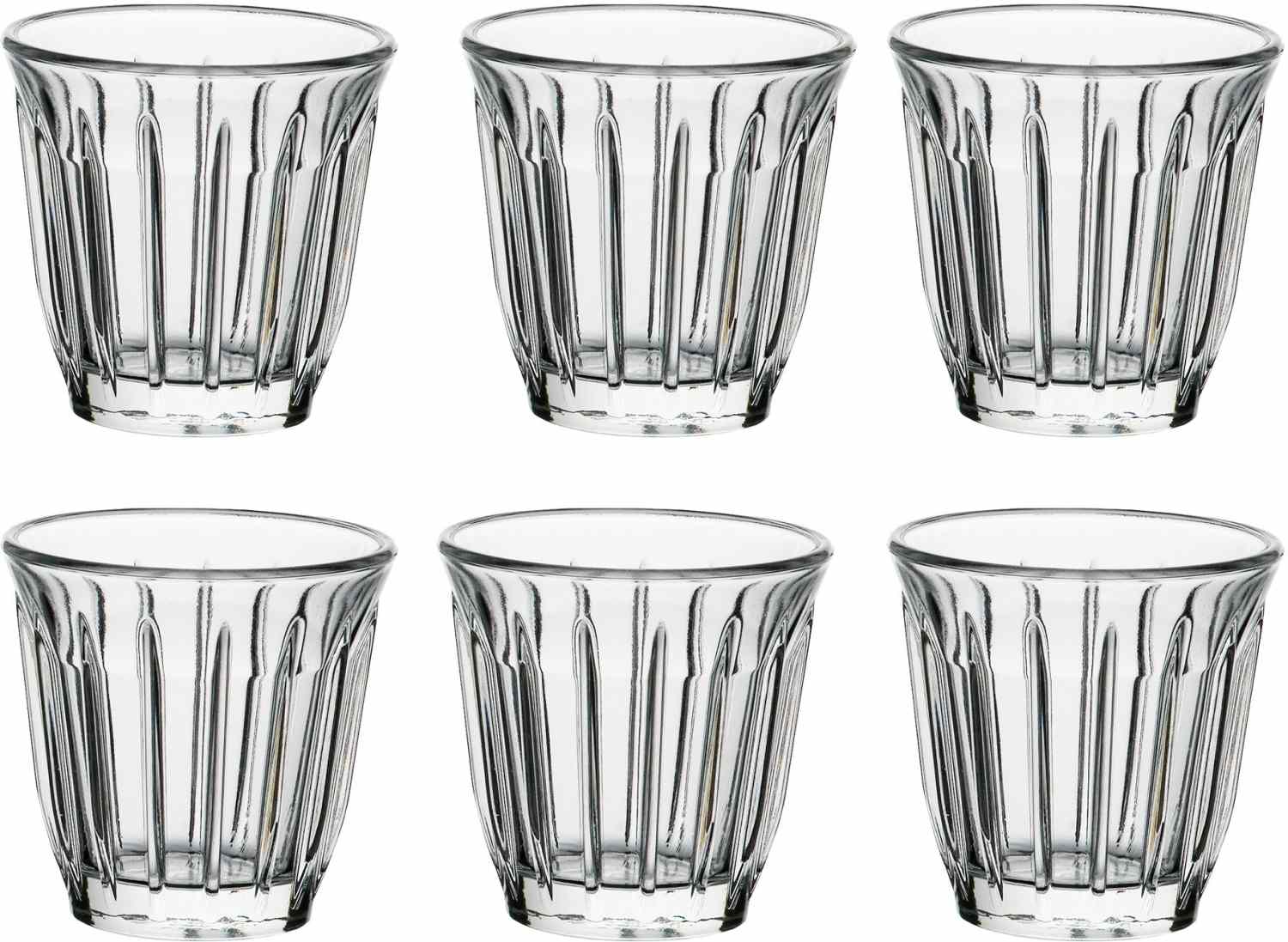 Sættet indeholder seks klare glas, der hver rummer 10 cl - den perfekte størrelse til en koncentreret espresso eller en lille stærk kaffe. Med en højde på 6,8 cm har glassene en kompakt men elegant profil, der passer perfekt ind i et moderne hjem med sans for detaljer og kvalitet.