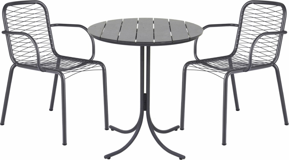 Dette elegante cafesæt kombinerer funktionel design med holdbare materialer, der er skabt til at modstå danske vejrforhold året rundt. Sættet består af et rundt bord med diameter på 67 cm og to stole fra Ivy Wire-serien, hvilket gør det til den perfekte løsning for altaner, balkoner og mindre udendørsområder.Bordet er udstyret med en bordplade i kompaktlaminat, et materiale der er kendt for sin formstabilitet og modstandsdygtighed mod vejrpåvirkninger. Designet er inspireret af den populære Marguerit-serie, men hvor det klassiske teaktræ er erstattet af et vedligeholdelsesfrit alternativ. Bordpladens lameller er gennemtænkt designet, så regnvand let kan tørres af, hvilket sikrer hurtig tørring efter regnvejr.