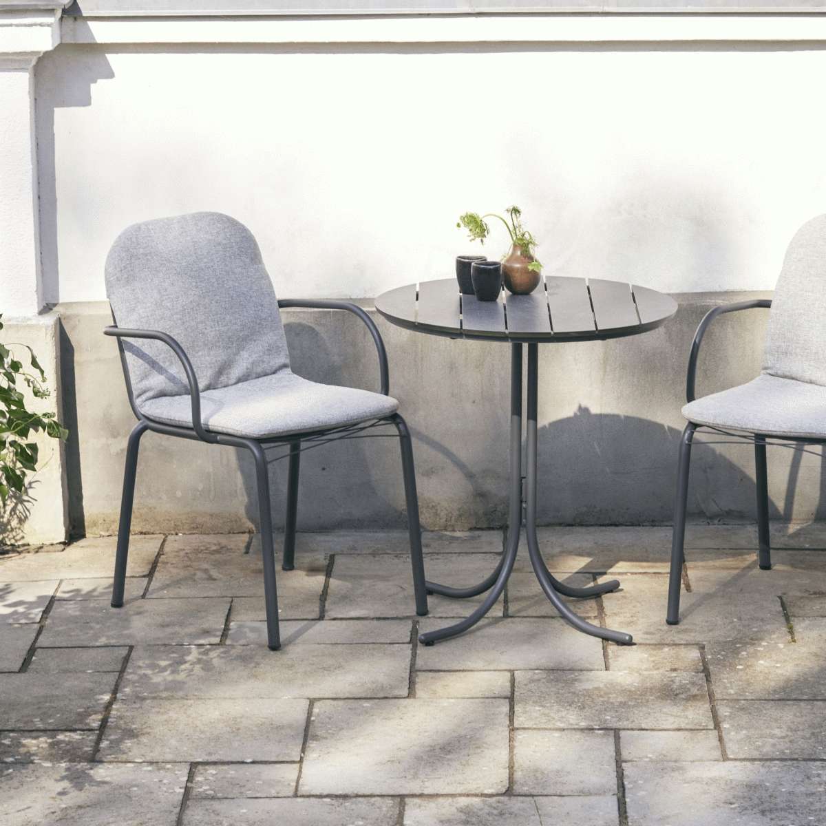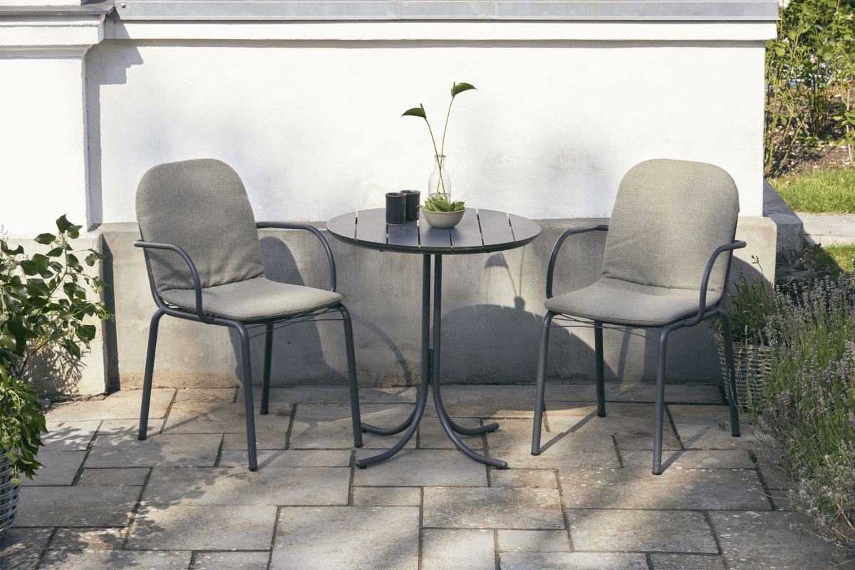 Cafesættet er specielt udviklet med fokus på tiny living og små uderum, hvor hver kvadratcentimeter tæller. Det runde bord med en diameter på 67 cm og en højde på 72 cm giver plads til hyggeligt samvær uden at fylde unødigt. Sættets vejrbestandige egenskaber betyder, at det kan stå fremme hele året uden behov for opbevaring i kælderrum eller under halvtag i vintermånederne.