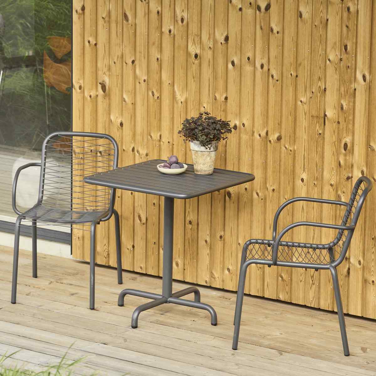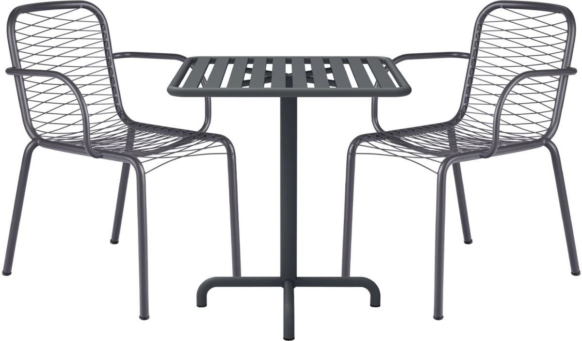 Cafésættet består af et firkantet Ivy cafébord og to Ivy Wire stole, der alle er fremstillet i pulverlakeret rustfrit stål. Dette robuste materiale gør sættet praktisk talt uforgængeligt og sikrer, at det kan stå fremme hele året uden at tage skade. For dem, der bor i lejlighed eller ikke har adgang til kælderrum eller loftsrum til opbevaring, er dette cafesæt den ideelle løsning.