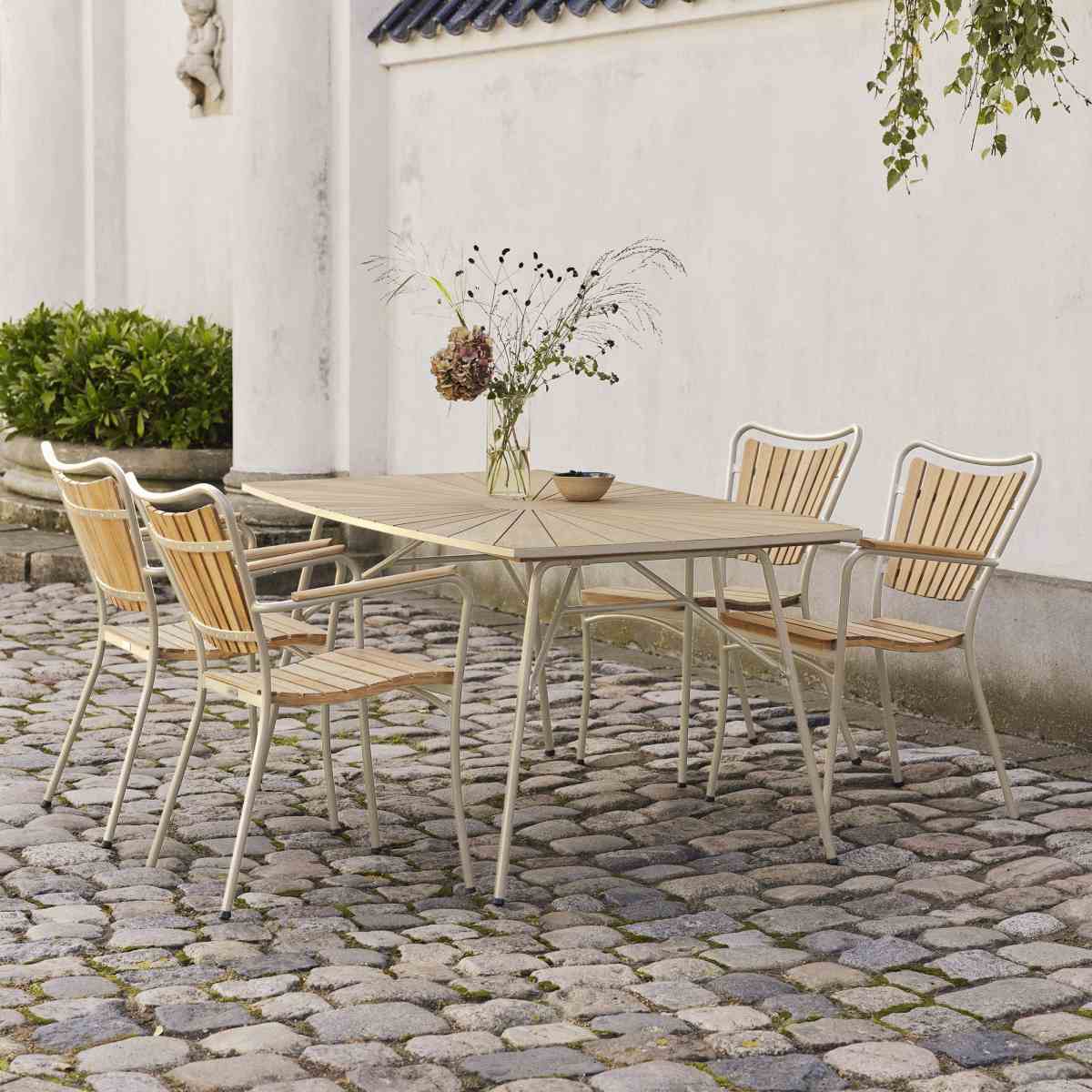 Mandalay Marguerit havemøbelsættet bringer den klassiske danske havestil tilbage til moderne hjem med et tidløst design, der har rødder i 1950'ernes og 1960'ernes kolonihaver. Dette sæt kombinerer traditionel æstetik med moderne materialer og funktionalitet, hvilket gør det til et ideelt valg for både altanen og den mindre terrasse.Havemøbelsættet består af et elegant bord og fire matchende stole, der alle er designet med fokus på komfort og holdbarhed. Bordet måler L144 x B90 x H72 cm og har en bordplade fremstillet i indonesisk teak, som er kendt for sin naturlige skønhed og styrke. Stellet er lavet af pulverlakeret aluminium i farven taupe, hvilket giver møblet en moderne finish samtidig med, at det er nemt at vedligeholde.
