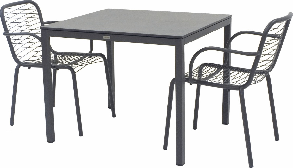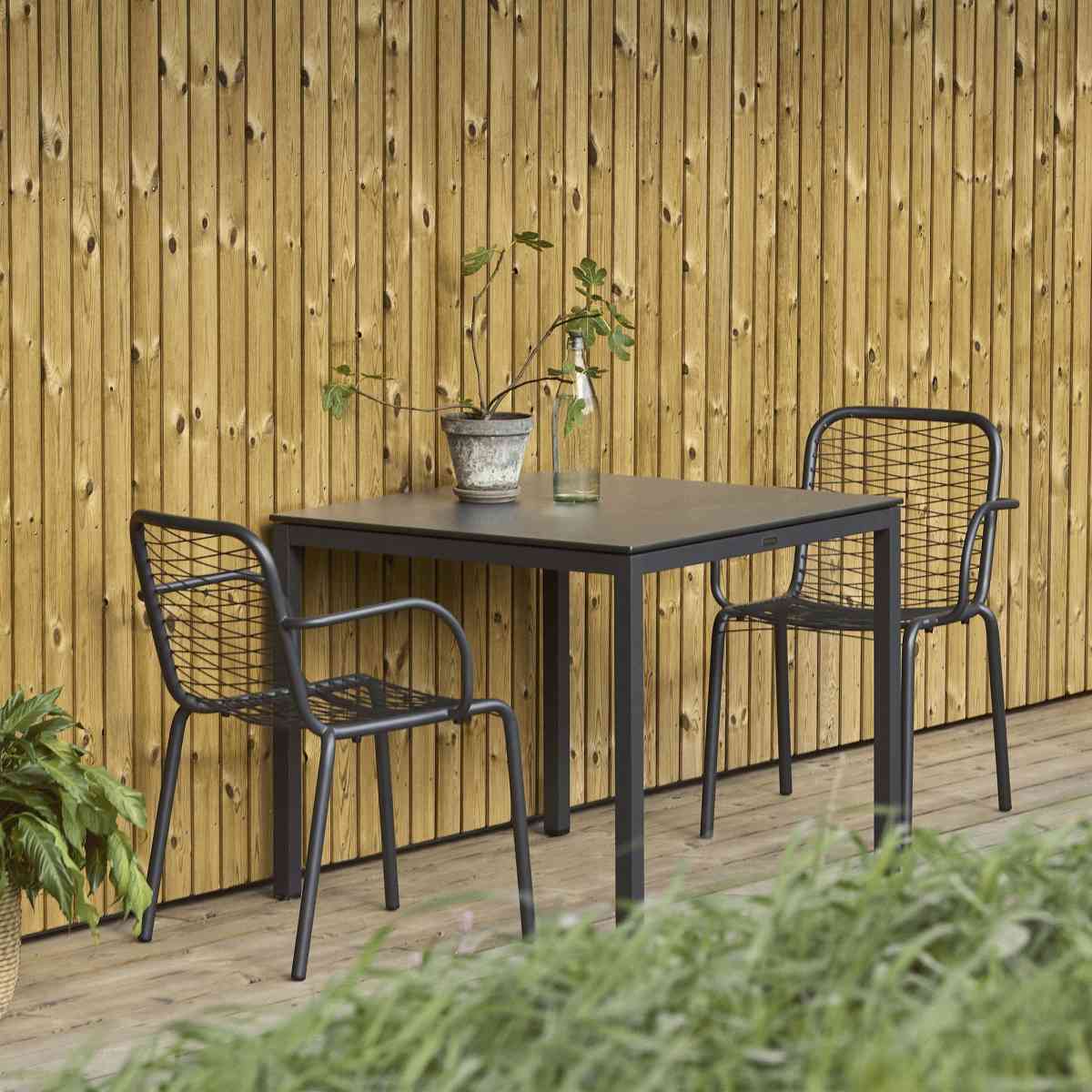 Pure & Ivy Wire havesæt fra Mandalay kombinerer funktionel elegance med et tidløst design, der passer perfekt til både altan og mindre terrasser. Settet består af et Pure bord på 82 cm og to Ivy Wire stole i antracit, som sammen skaber en harmonisk helhed på din udendørs oase.Pure-bordet er designet med en bordplade i kompaktlaminat med skiffer-look, der giver et stilfuldt og afdæmpet udtryk. Kompaktlaminat er kendt for sin slidstyrke og ridsefasthed, og materialets formstabilitet sikrer, at bordet bevarer sit flotte udseende år efter år. Bordpladen påvirkes ikke af temperatursvingninger, hvilket gør den ideel til det danske klima med skiftende vejrforhold. Med mål på 82 cm i længden og 90 cm i bredden er bordet perfekt dimensioneret til mindre udendørsarealer, eller det kan fungere som et praktisk tillægsbord til større arrangementer.