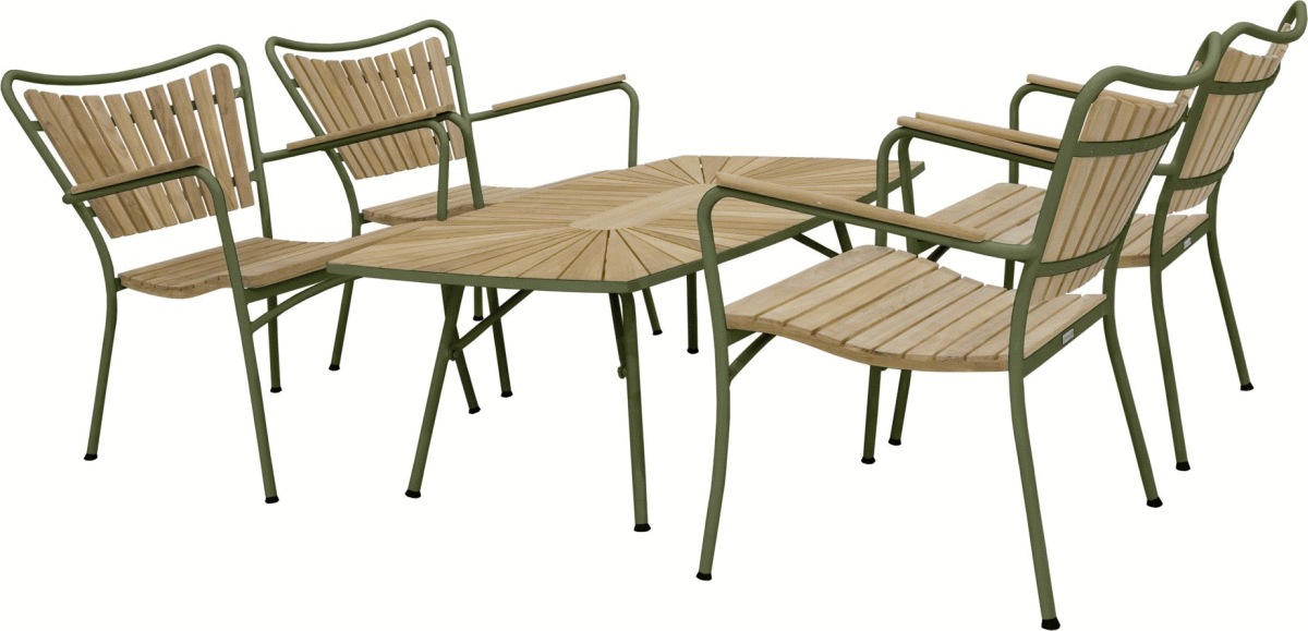 Sættets kombination af teak og pulverlakeret aluminium giver både en varm æstetik og robust holdbarhed, der kan modstå varierende vejrforhold. Den olivengrønne farve tilføjer en moderne og stilfuld note, der passer naturligt ind i haven eller på altanen. Teaktræets naturlige egenskaber og aluminiumets lette konstruktion sikrer, at møblerne er nemme at flytte rundt efter behov, samtidig med at de bevarer deres elegante udtryk sæson efter sæson.