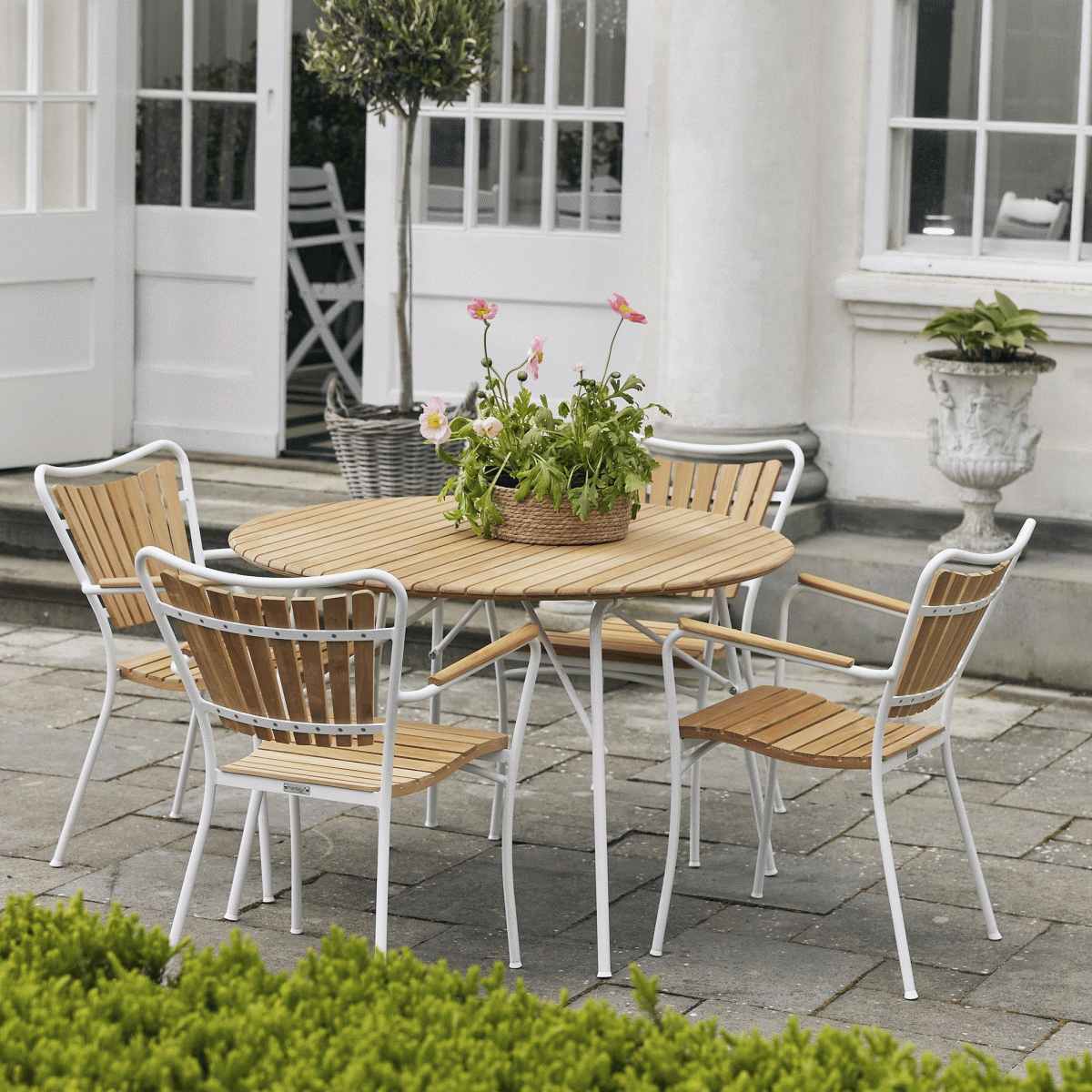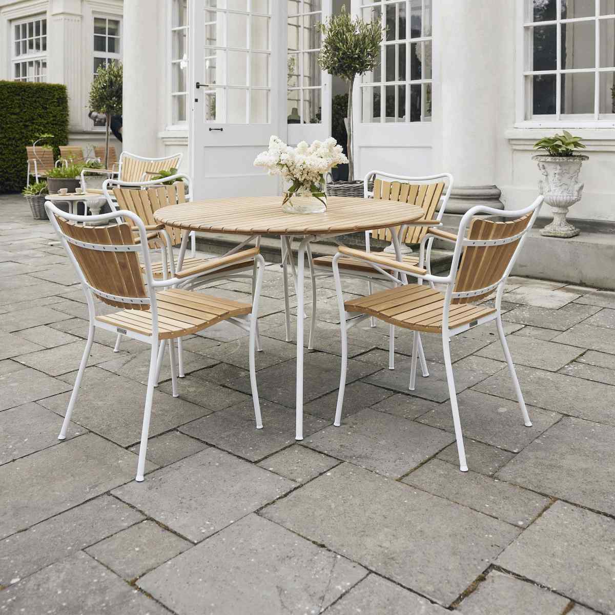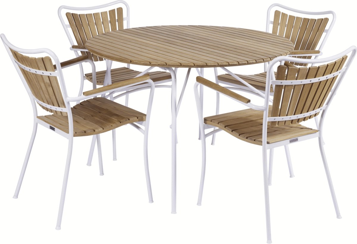 Mandalay havemøbelsættet kombinerer tidløs design med funktionalitet og skaber den perfekte ramme om hyggelige stunder i haven. Sættet består af det runde Magnolia havebord med en diameter på 110 cm samt fire elegante Marguerit havestole i en harmonisk hvid finish. Dette møbelsæt er designet til dem, der ønsker kvalitet og æstetik uden at overskride budgettet.Magnolia havebordet er udviklet som et prisvenligt alternativ til det klassiske Marguerit bord, men uden at gå på kompromis med hverken design, materialer eller kvalitet. Bordpladen er fremstillet i naturlig teak, der med sin varme nuance og karakteristiske struktur tilfører autenticitet og charme til enhver udendørs setting. Stellet er lavet af pulverlakeret aluminium i hvid farve, hvilket giver bordet en let og moderne fremtoning samt sikrer lang holdbarhed mod vejrlig.