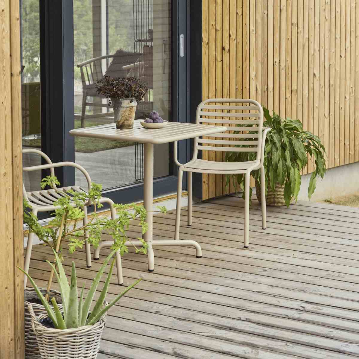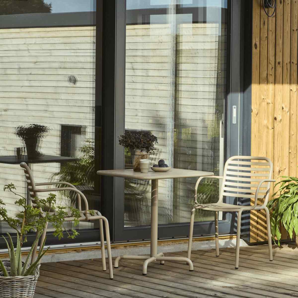 Ivy cafébordet har en kvadratisk bordplade i robust materiale, der kan modstå årstidernes skiftende vejrforhold. Den regulære størrelse på 66 x 66 cm gør det ideelt til mindre uderum, hvor hver centimeter tæller. Bordets højde på 72 cm sikrer en behagelig spisehøjde, der passer perfekt til de medfølgende stole.