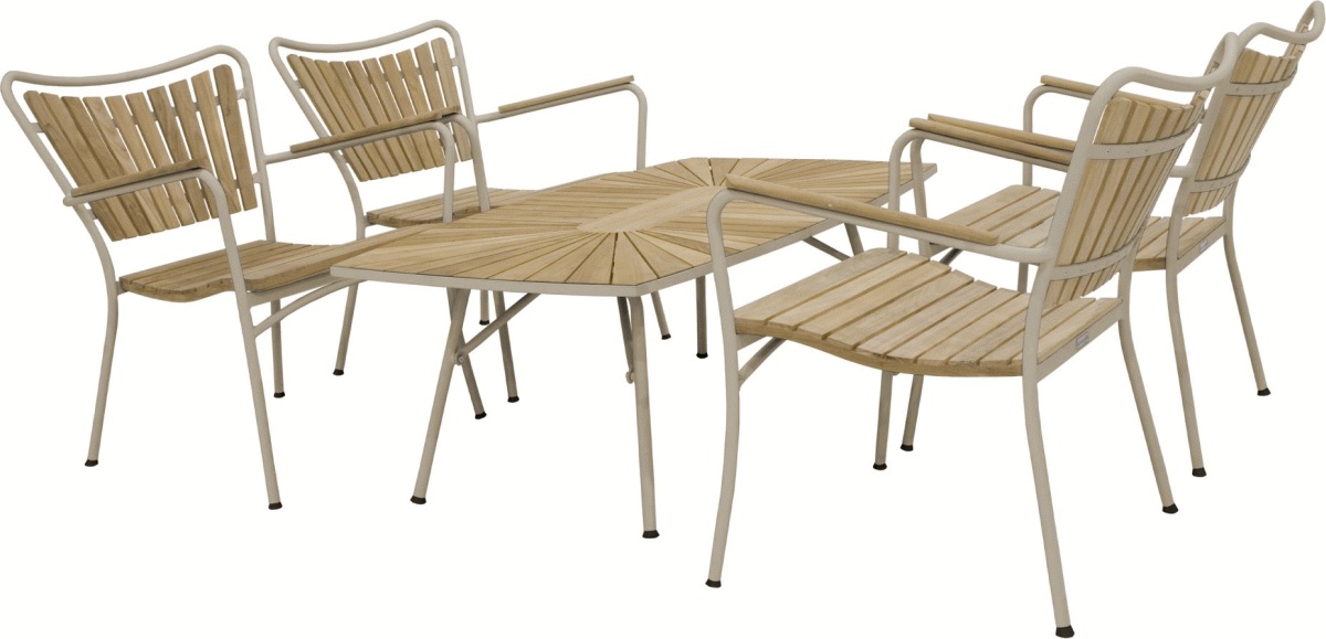 Konstruktionen bygger på en kombination af teak og pulverlakeret aluminium, hvilket sikrer både holdbarhed og et let design. Teaktræet tilfører varme og naturlig karakter, mens aluminiumsrammen holder vægten nede og gør møblerne nemme at flytte rundt efter behov. Det pulverlakerede finish beskytter mod vejr og vind, så sættet bevarer sit flotte udseende sæson efter sæson.