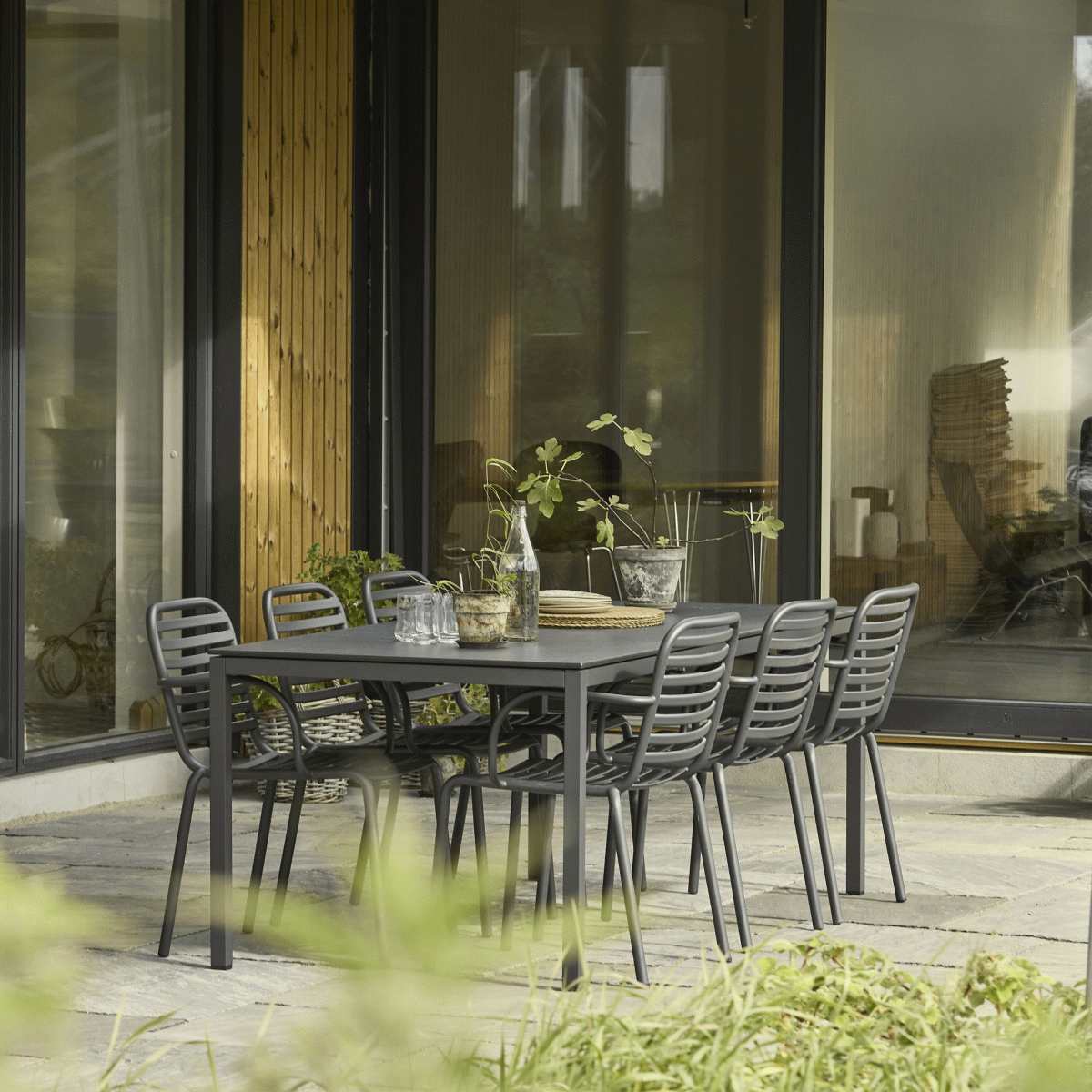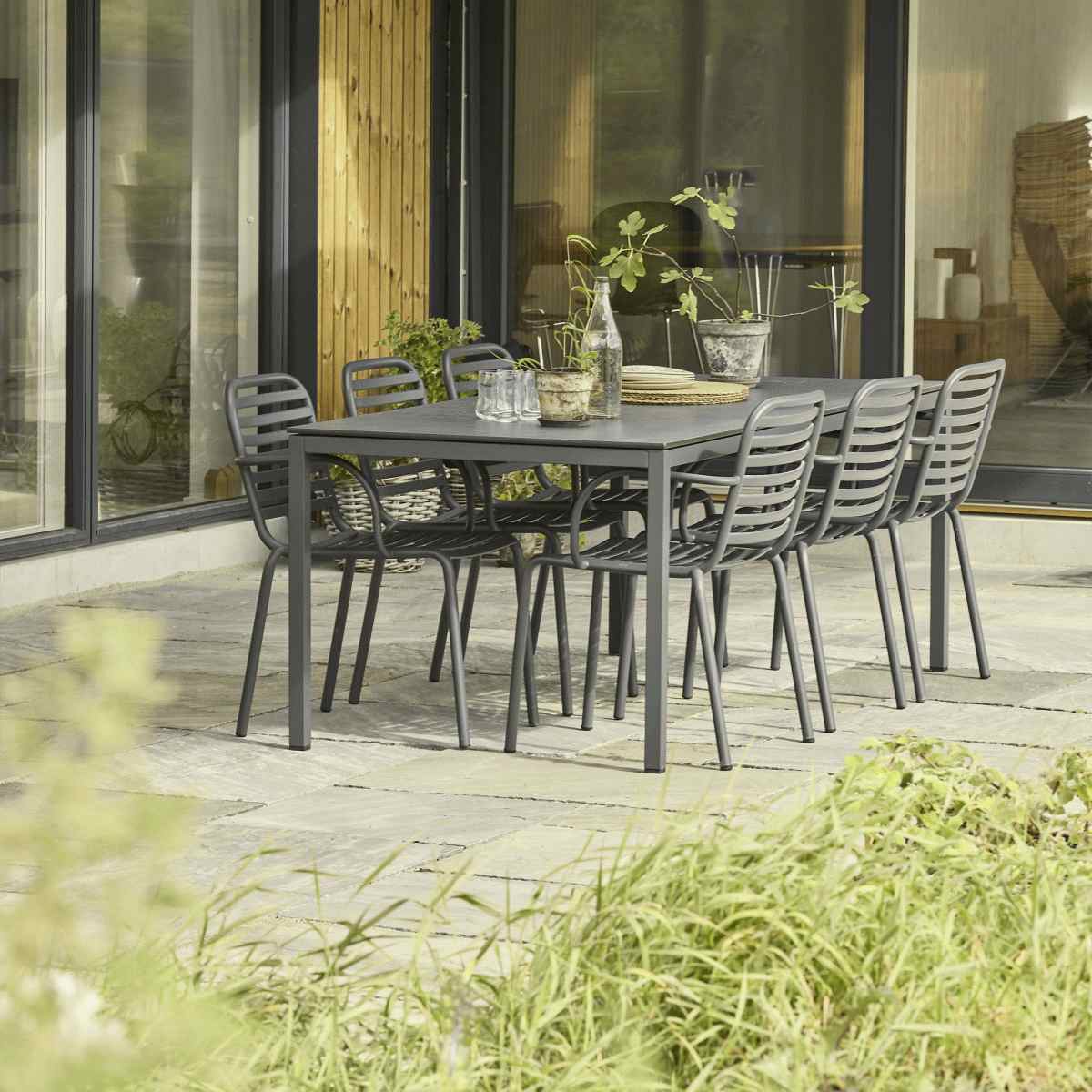 Mandalay havemøbelsættet kombinerer funktionel elegance med nordisk designtradition og skaber den perfekte ramme om måltider og samvær på terrassen. Sættet består af Pure-bordet på 197 cm og seks Ivy Pipe-stole, der alle er kendetegnet ved deres gennemtænkte konstruktion og tidløse udtryk i antracit.Pure-bordet imponerer med sin bordplade i kompaktlaminat, der har en smuk skiffer-look med afdæmpet overflade. Materialevalget er ikke tilfældigt – kompaktlaminat er kendt for sin slidstyrke, formstabilitet og ridsebestandighed. Bordpladen påvirkes ikke af temperatursvingninger, hvilket gør den ideel til danske vejrforhold, hvor regn, sol og temperaturskift er en del af hverdagen. Fuldpladen giver ikke blot robusthed, men også et harmonisk helhedsindtryk i det minimalistiske design.