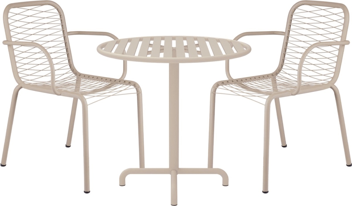 Ivy Wire stolene er en gennemtænkt del af dette cafésæt. De er udelukkende fremstillet i pulverlakeret rustfrit stål, hvilket sikrer en lang levetid og minimal vedligeholdelse. Stolene kombinerer komfort med funktionalitet på elegant vis, og deres design gør dem både lette at håndtere og behagelige at sidde på gennem længere tid. En praktisk detalje er, at stolene kan stables, hvilket giver ekstra fleksibilitet, når man har brug for mere plads på altanen eller balkonen.