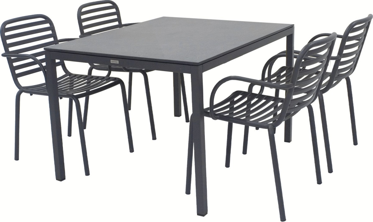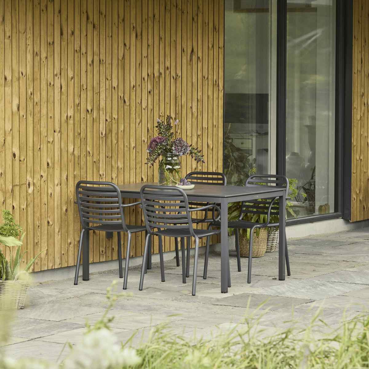 Mandalay havemøbelsættet med Pure bord og fire Ivy Pipe stole kombinerer funktionel innovation med tidløs elegance. Dette sæt er skabt til dem, der ønsker møbler, der holder i mange år uden at kræve vedligeholdelse, samtidig med at det tilføjer en raffineret atmosfære til terrassen eller altanen.Pure-bordet imponerer med sin bordplade i kompaktlaminat med skiffer-look, der giver et afdæmpet og naturligt udtryk. Materialet er både slidstærkt, formstabilt og ridsefrit, hvilket gør det perfekt til udendørs brug året rundt. Kompaktlaminaten påvirkes ikke af temperatursvingninger og klarer det danske vejr uden problemer. Bordets minimalistiske design med fuldplade skaber et harmonisk helhedsindtryk, hvor funktionalitet møder æstetik.