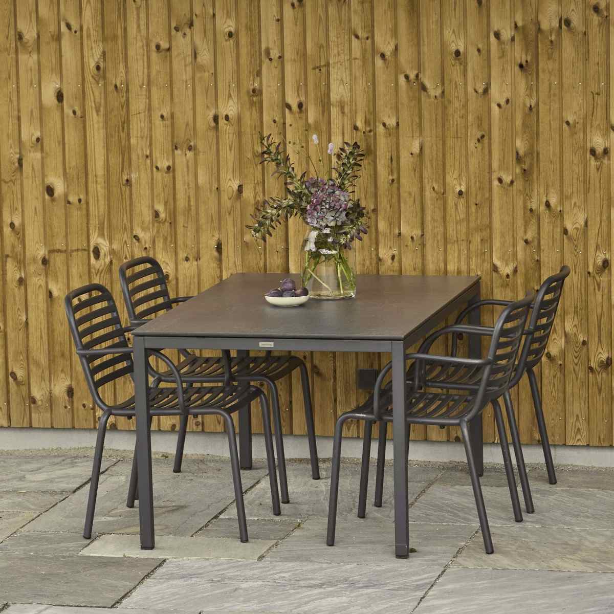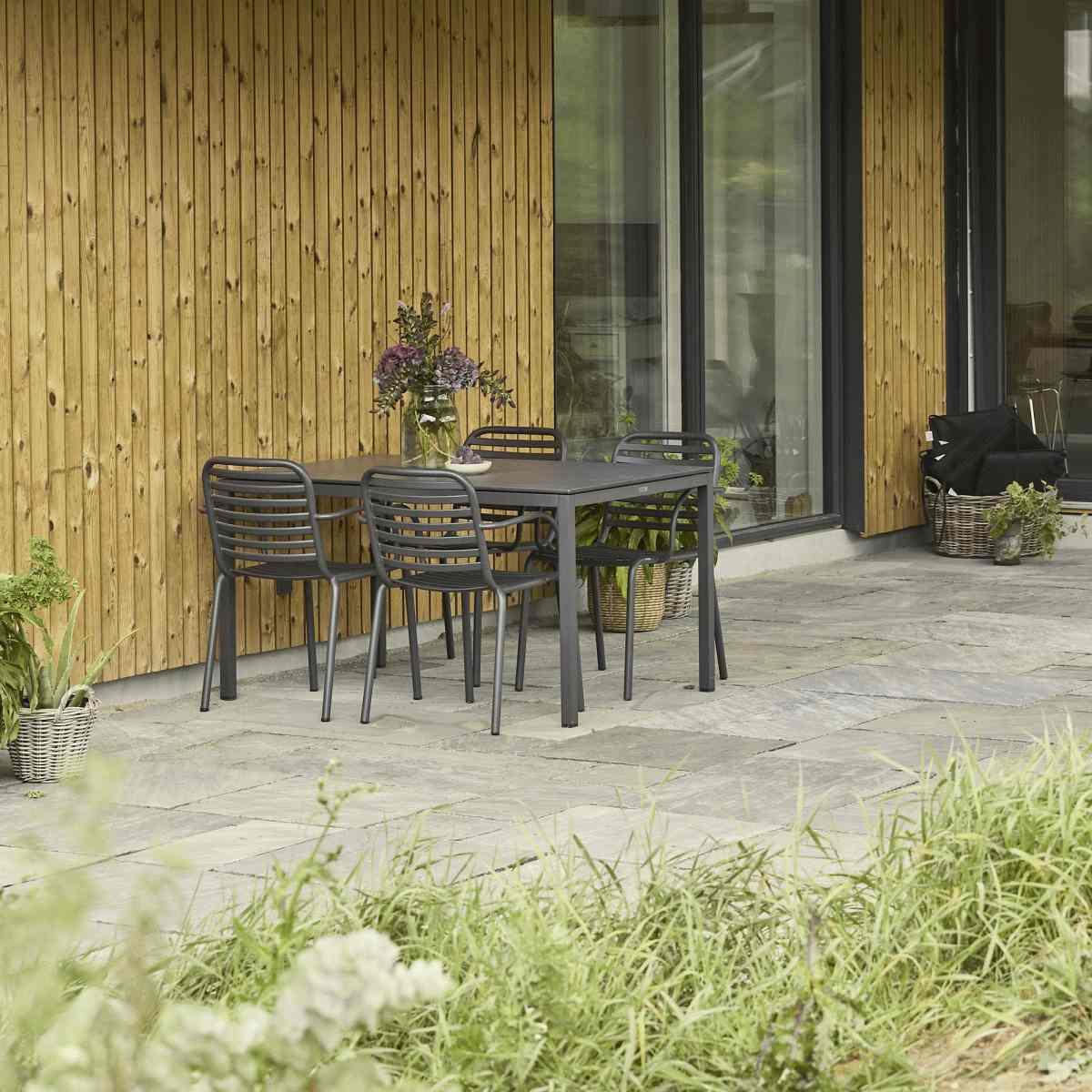 Pure-bordet imponerer med sin bordplade i kompaktlaminat med skiffer-look, der giver et afdæmpet og naturligt udtryk. Materialet er både slidstærkt, formstabilt og ridsefrit, hvilket gør det perfekt til udendørs brug året rundt. Kompaktlaminaten påvirkes ikke af temperatursvingninger og klarer det danske vejr uden problemer. Bordets minimalistiske design med fuldplade skaber et harmonisk helhedsindtryk, hvor funktionalitet møder æstetik.