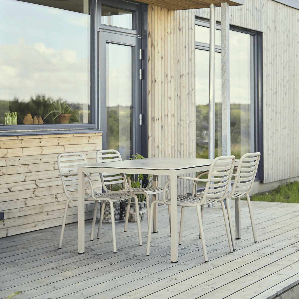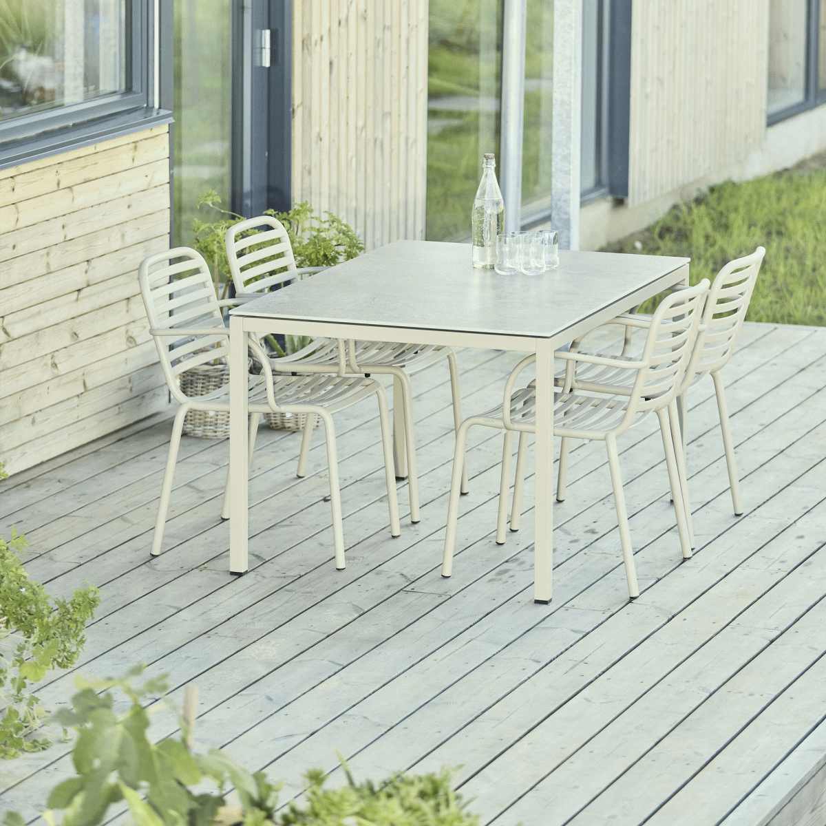Mandalay havemøbelsæt præsenterer en gennemtænkt kombination af Terra-bordet og fire Ivy Pipe havestole, der sammen skaber en harmonisk helhed på terrassen. Settet udmærker sig ved sin tidløse formgivning og varme taupe-farve, som passer naturligt ind i enhver udemiljø.Terra-bordet er fremstillet i pulverlakeret aluminium med et robust stel i taupe-nuancen. Bordpladen er udført i meleret keramik, som giver en blød og indbydende overflade med et eksklusivt udtryk. Keramikken er kendt for sin hårdførhed og modstandsdygtighed mod daglig brug. Materialet tåler varme, ridser og pletter, samtidig med at det ikke absorberer væske. Overfladen er UV-bestandig og bevarer sit oprindelige udseende uden at falme, selv efter mange sæsoner i vejr og vind. Rengøringen er ligetil og kræver ingen særlig behandling.