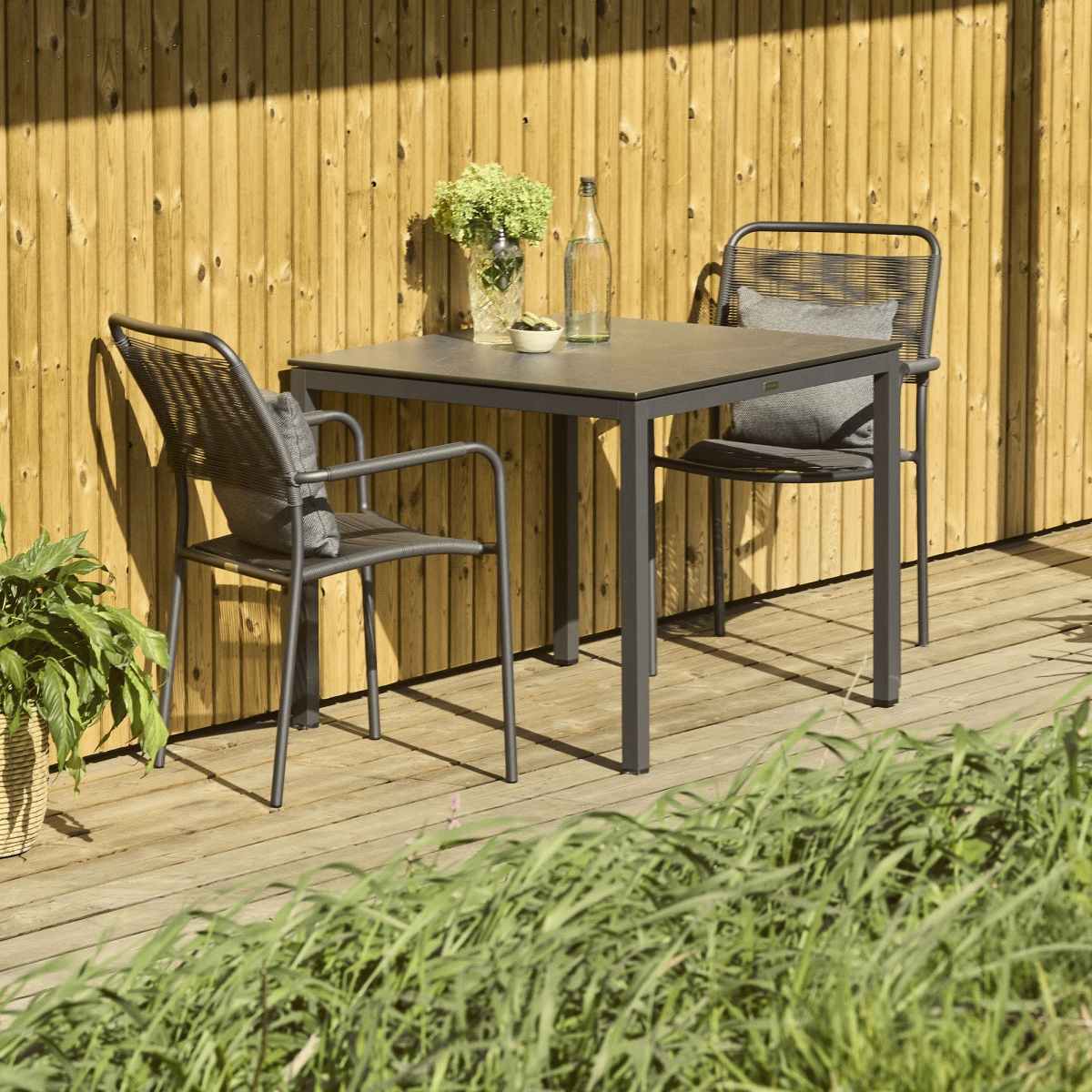 Mandalay Havemøbelsæt med Pure Bord og Verona Stole skaber den perfekte ramme om hyggestunderne på altanen eller den lille terrasse. Dette velafstemt sæt kombinerer funktionel design med slidstærke materialer, der sikrer mange års glæde udendørs.Pure bordet er udstyret med en bordplade i kompaktlaminat med elegant skifer-look, der både er slidstærk og ridsefast. Materialet tåler vand, olie og frost, hvilket gør det ideelt til danske vejrforhold. Med sine 82 cm i længden og 90 cm i bredden passer bordet perfekt til mindre udendørsarealer, og det fungerer lige så godt som tillægsbord ved større sammenkomster. Stellet er fremstillet i pulverlakeret aluminium, som sikrer både stabilitet og lang levetid.