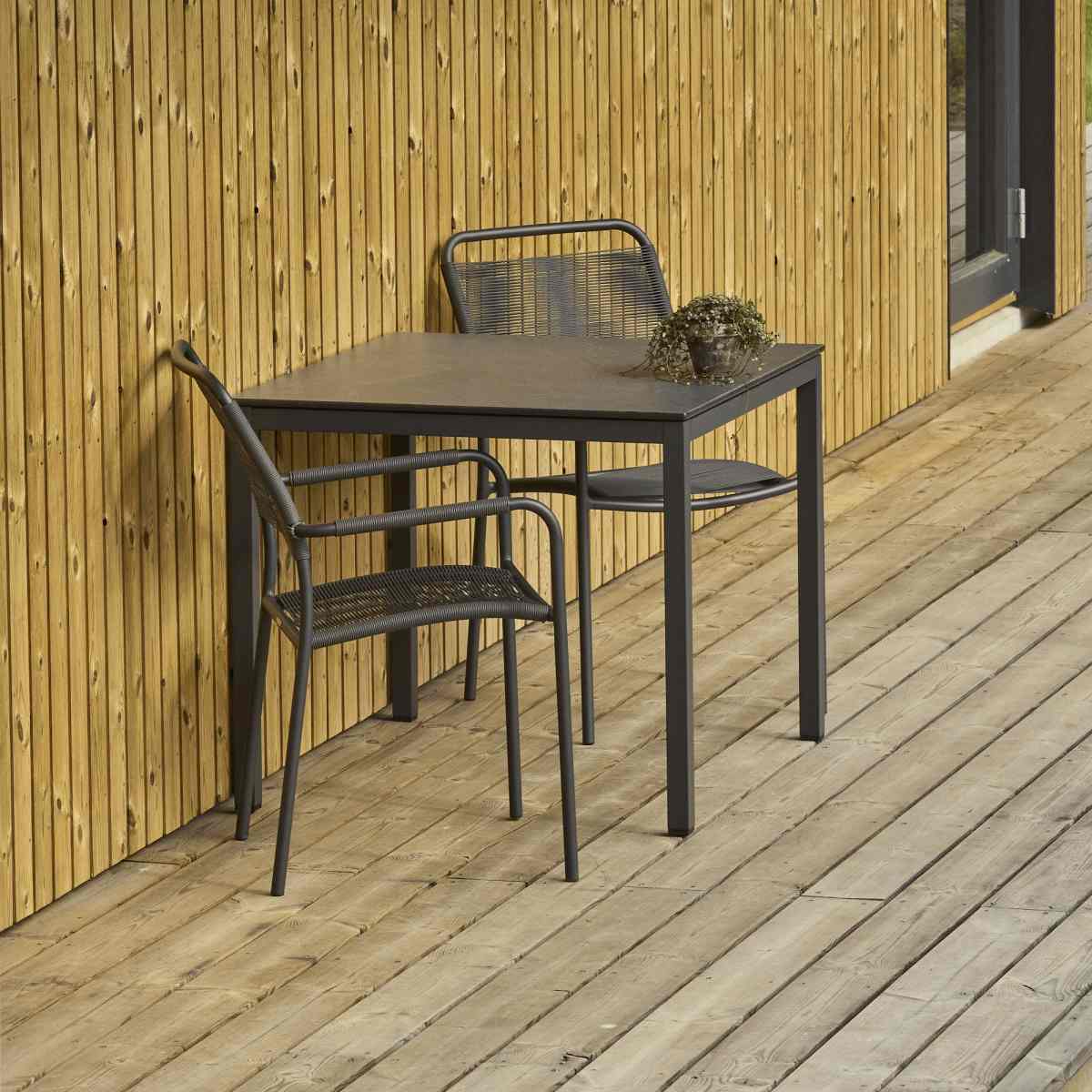 Pure bordet er udstyret med en bordplade i kompaktlaminat med elegant skifer-look, der både er slidstærk og ridsefast. Materialet tåler vand, olie og frost, hvilket gør det ideelt til danske vejrforhold. Med sine 82 cm i længden og 90 cm i bredden passer bordet perfekt til mindre udendørsarealer, og det fungerer lige så godt som tillægsbord ved større sammenkomster. Stellet er fremstillet i pulverlakeret aluminium, som sikrer både stabilitet og lang levetid.