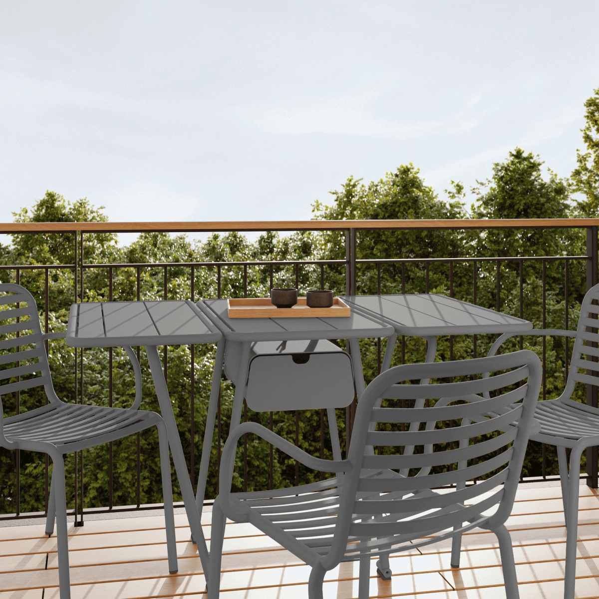 Ivy Klapbord er udstyret med en praktisk udtræksskuffe, der tilføjer ekstra funktionalitet. Skuffen giver mulighed for at opbevare mindre genstande som bestik, servietter eller andre bordrelaterede ting, så de er let tilgængelige, men samtidig holdt diskret væk. Dette gennemtænkte detalje viser, hvordan designet tager højde for de praktiske udfordringer ved at indrette små udendørsområder.