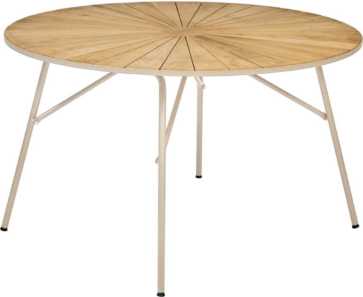 Mandalay Marguerit Havebord i taupe-farven er en elegant fortolkning af en velkendt havemøbelklassiker, der bringer dansk havekultur og hygge ind på terrassen. Dette foldebord i Ø120 cm kombinerer tidløst design med funktionel elegance og skaber en indbydende ramme om de store sammenkomster i haven.Den afdæmpede taupe-farve giver bordet et blødt og moderne udtryk. Den diskrete latte-nuance harmonerer smukt med forskellige indretningsstile og komplementerer både teaktræets gyldne glød og den sølvgrå patina, som træet naturligt udvikler over tid. Denne farvevalg gør bordet til et alsidigt element, der passer ind i både klassiske og moderne havemiljøer.