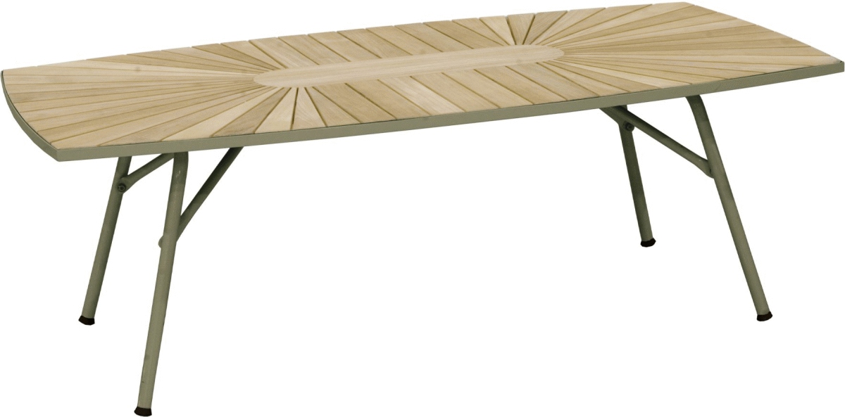 Mandalay Marguerit Loungebord 130 cm i Olivengrøn bringer en moderne og funktionel atmosfære til din terrasse eller udestue. Dette lave foldebord er designet til at passe perfekt sammen med loungestole fra Marguerit-serien, så du nemt kan skabe et harmonisk loungeområde udendørs. Med sin olivengrønne farve og elegante materialevalg kombinerer bordet stilfuld æstetik med praktisk funktionalitet.Bordet er fremstillet i indonesisk plantageteak og pulverlakeret aluminium, hvilket sikrer en robust konstruktion, der ikke ruster. Teakets naturlige egenskaber gør det velegnet til udendørs brug, mens det pulverlakerede aluminium tilføjer både styrke og holdbarhed. Det lave design gør bordet ideelt til afslappede stunder i loungen, hvor det fungerer som et praktisk supplement til dine havemøbler.
