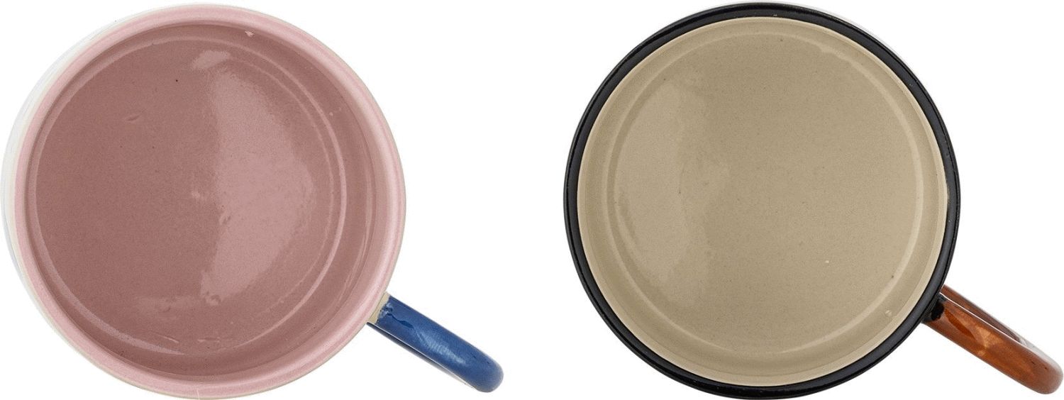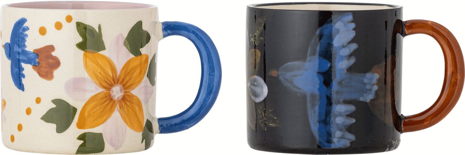 Hvert motiv er håndmalet, hvilket betyder, at der kan forekomme små variationer i mønster og farvestyrke fra kop til kop. Denne unikhed er en del af koppernes charme og understreger det håndværksmæssige udtryk, som Bloomingville er kendt for. Stentøjsmaterialet sikrer en robust og holdbar konstruktion, der tåler daglig brug og giver en behagelig vægt i hånden.