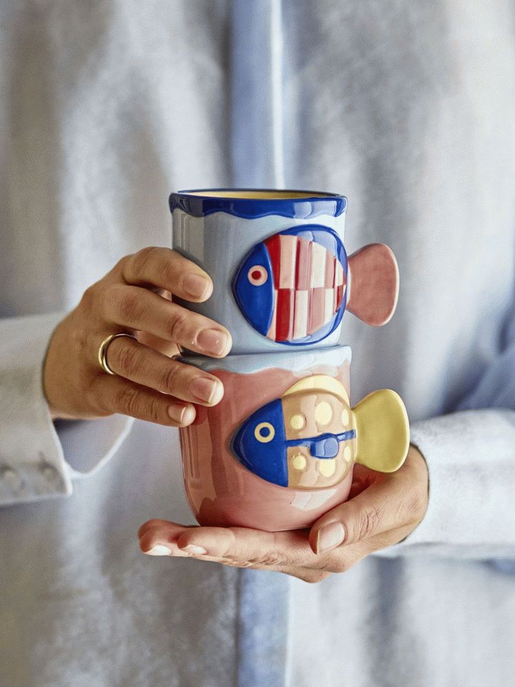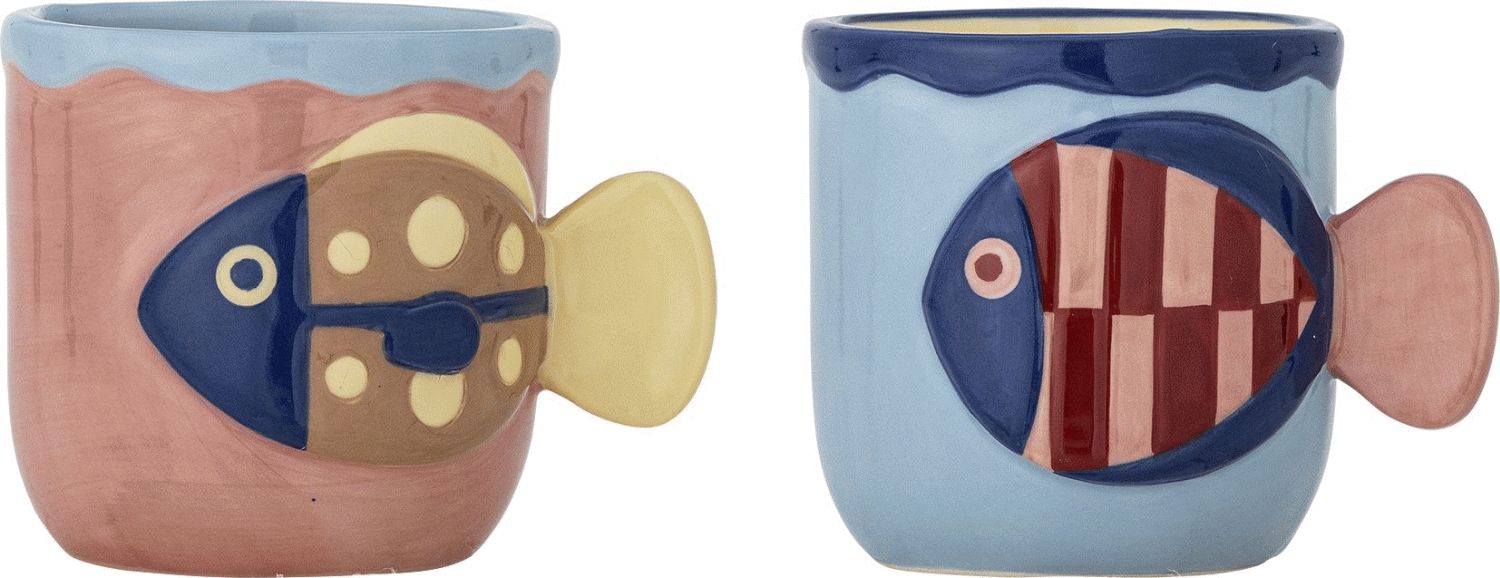 - Sæt med to kopper i stentøj med præget fiskemotiv