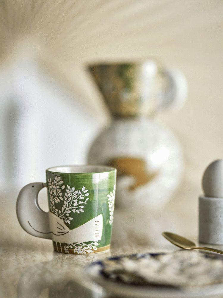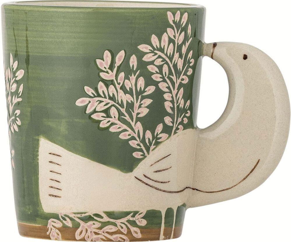 Hezha Koppen fra Bloomingville forener funktionel elegance med kunstnerisk håndværk i et design, der bringer personlighed til bordet. Denne charmerende kop er fremstillet i stentøj og præsenterer en dyb grøn nuance, der skaber en rolig og indbydende atmosfære ved enhver servering.Det håndmalede udtryk giver koppen et autentisk og levende præg. De fine rosa blomstermotiver danner en smuk kontrast til den grønne baggrund og tilføjer en blid, feminin detalje. Den skulpturelle hank er formet som et fuglehoved, hvilket gør koppen til et lille kunstværk i sig selv. Dette dekorative element giver ikke blot et sikkert greb, men også en unik karakter, der adskiller sig fra traditionelle kopper.
