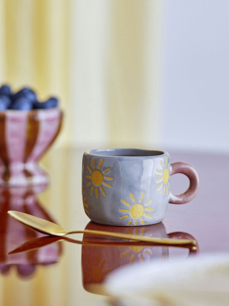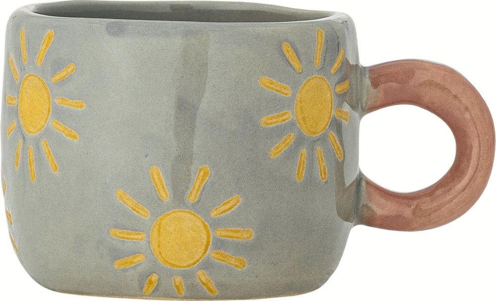 Nini Koppen fra Bloomingville bringer en levende og legende stemning til bordet med sit karakteristiske solmotiv på en dyb blå baggrund. Den runde hank i varm rosa skaber en smuk kontrast, der gør koppen til et lille kunstværk i sig selv. Med sin kompakte størrelse på 11 cl er den ideel til espresso, cortado eller en lille kop stærk morgenkaffe.Koppen er fremstillet i robust stentøj, et materiale der er kendt for sin holdbarhed og evne til at bevare varmen i drikkevarerne. Den håndmalede finish giver hvert enkelt eksemplar sit eget unikke udtryk, så ingen to kopper er helt ens. Netop denne håndværksmæssige tilgang sikrer, at du får et produkt med personlighed og autenticitet. Små variationer i mønster og farveintensitet er derfor en naturlig del af koppens charme og vidner om den omhyggelige fremstillingsproces.