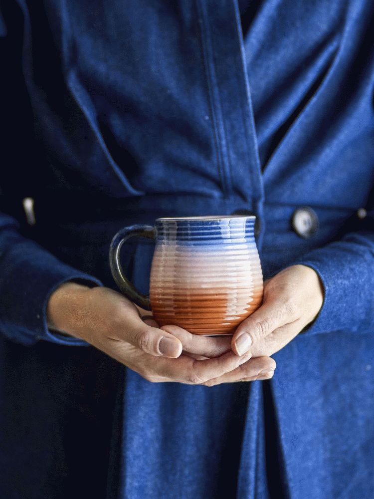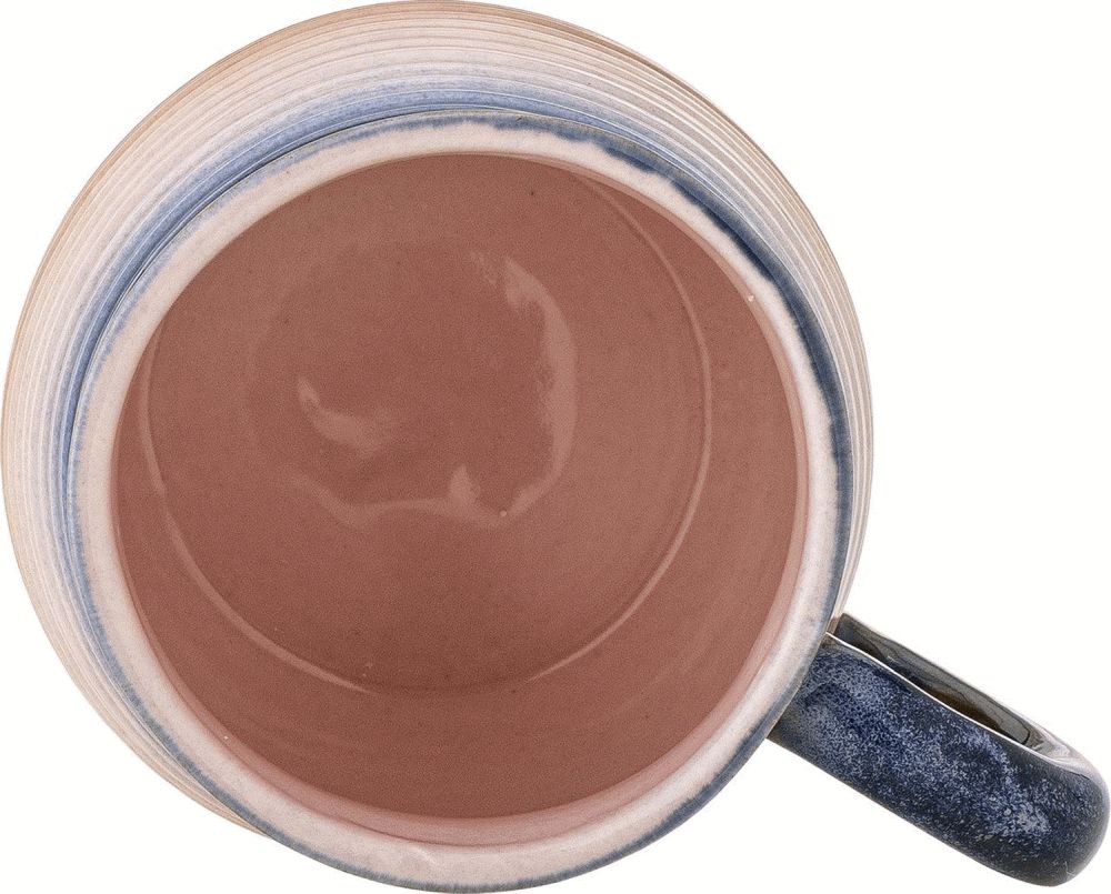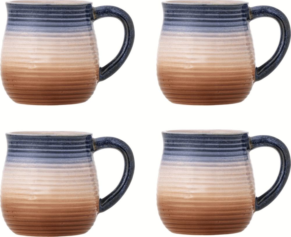 Disse fire kopper i stentøj bringer en blød og harmonisk farvepalet ind i dit hjem. Designet er kendetegnet ved en rillet overflade, der giver kopperne en taktil dimension og et håndværksmæssigt udtryk. Den blanke glasur fremhæver de skiftende nuancer af rosa, terrakotta og blå, som glider elegant over fra hank til kant.