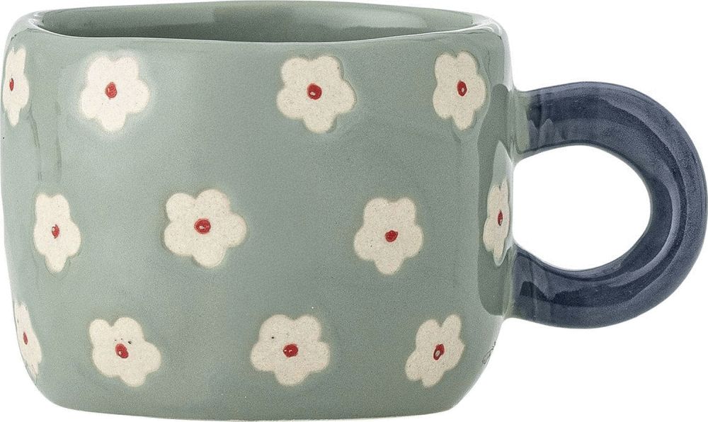 Nini Koppen fra Bloomingville er en charmerende kop i stentøj, der kombinerer funktionalitet med et smukt, håndværksmæssigt udtryk. Med sin runde form og dybe hank ligger koppen behageligt i hånden og gør den ideel til morgenkaffen, en varm te eller en lille espresso. Den blanke glasur giver koppen et elegant finish, mens den bløde blå overflade skaber en rolig og indbydende atmosfære.Det karakteristiske design er prydet med jævnt placerede hvide blomster, der er udformet med en diskret prægning. Denne detalje tilføjer dybde og tekstur til koppen og gør den til mere end blot et funktionelt redskab – den bliver et smukt element i dit køkken eller på dit spisebord. De små variationer i mønster og farvestyrke, som naturligt opstår i produktionen, sikrer, at hver enkelt kop er unik og har sin egen personlighed.