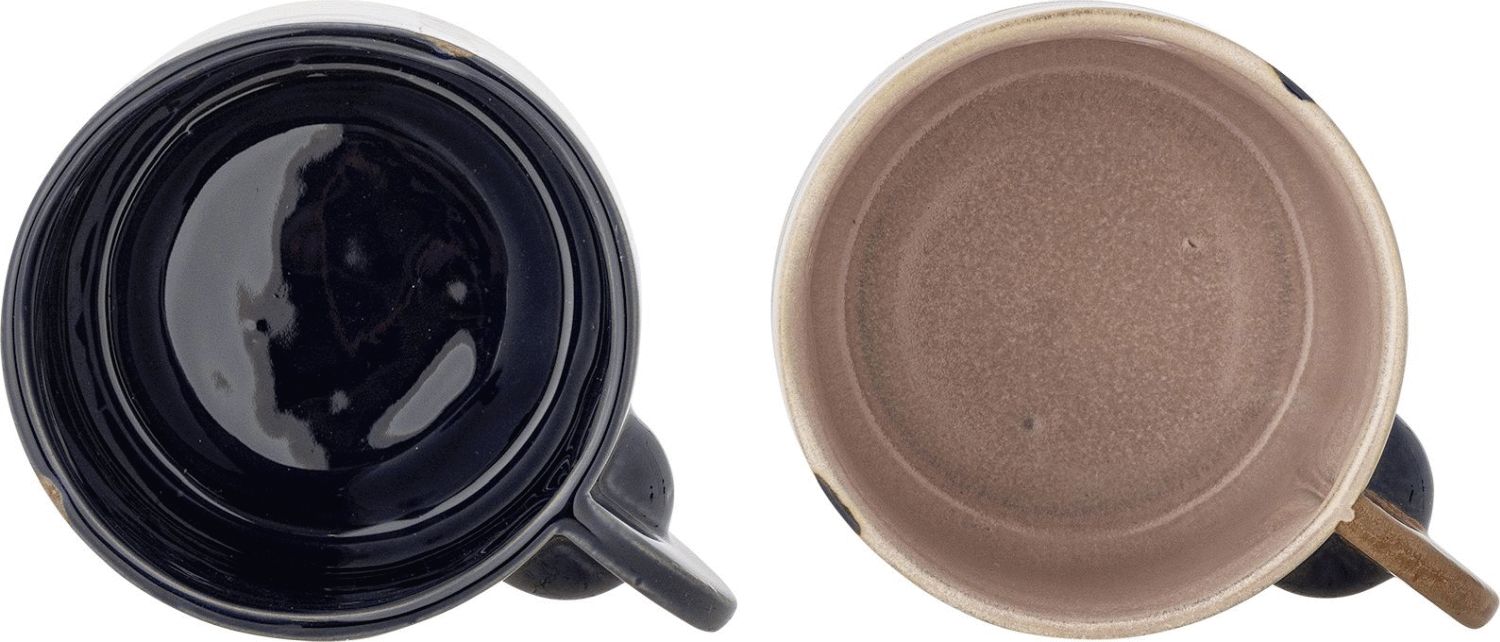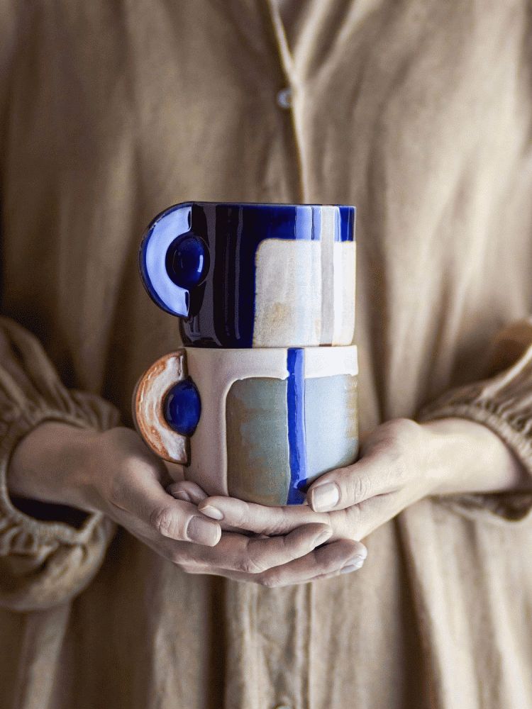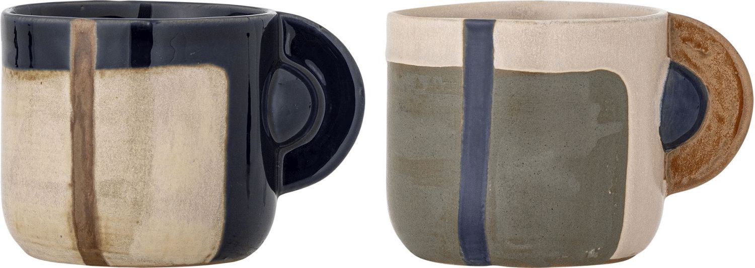Bolivia koppen fra Bloomingville bringer en kunstnerisk dimension til borddækningen med sit karakteristiske håndmalede design. Dette sæt består af to kopper i stentøj, hvor hver enkelt er forarbejdet med en reaktiv glasur, der skaber et levende og dynamisk udtryk. Det geometriske mønster kombinerer dybe marineblå felter med varme beige og rosa nuancer, hvilket giver kopperne en moderne og alligevel tidløs æstetik.Håndværket bag disse kopper sikrer, at ingen to er helt ens. Den håndmalede overflade betyder, at små variationer i mønster og farveintensitet naturligt opstår under produktionen, hvilket gør hver kop til et unikt stykke. Denne individuelle karakter tilføjer personlighed til bordet og gør kopperne til mere end blot funktionelle genstande – de bliver små kunstværker i hverdagen.
