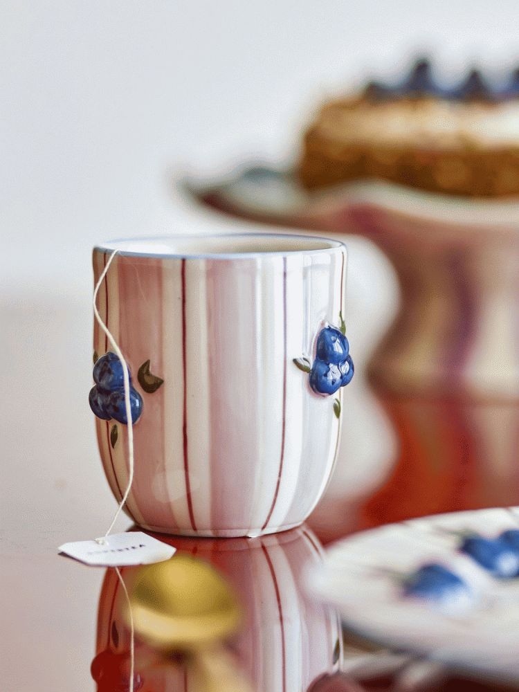 De cremefarvede striber og de fine blomstermotiver skaber en harmonisk kontrast til de bløde rosa nuancer, der pryder koppernes yderside. Indersiden er holdt i en frisk lyseblå farve, som giver et overraskende og levende element, når koppen tages i brug. Denne kombination af farver og mønstre gør Carry Koppen til et smukt tilvalg til både hverdagsbrug og mere festlige anledninger.