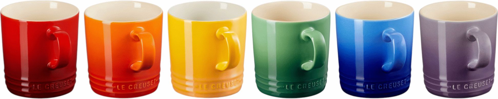 Le Creuset Rainbow Krus-sættet bringer livlige farver og tidløs kvalitet ind i dit køkken med seks smukke krus i 35 cl størrelse. Dette farverige arrangement er designet til at glæde både øjet og sindet, mens det leverer den funktionalitet og holdbarhed, som Le Creuset er verdensberømt for.Hvert krus er fremstillet af Le Creusets karakteristiske stentøj, der er skabt af særlige lertyper og brændt ved de højeste temperaturer for at sikre maksimal styrke og holdbarhed. Den forseglede struktur giver enestående varmebestandighed og fastholder en jævn temperatur under brug, hvilket gør disse krus ideelle til både varme og kolde drikke.