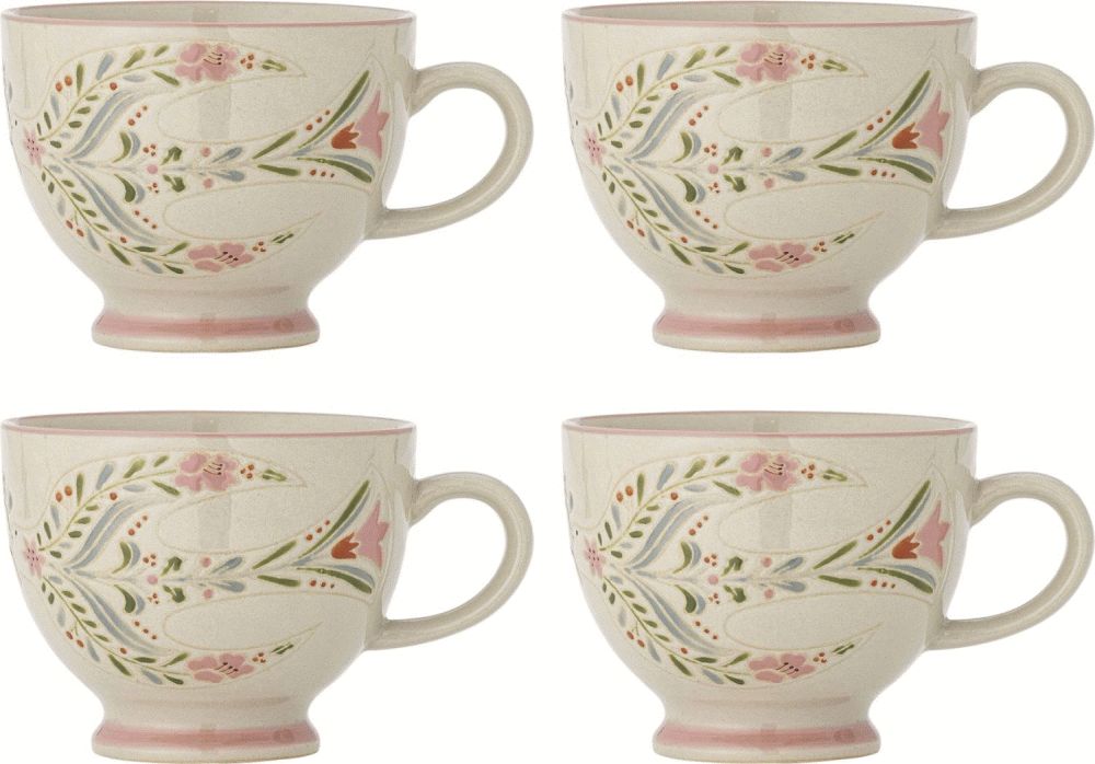 Dette elegante sæt af fire krus fra Creative Collection bringer en blid og personlig stemning til bordet. Rosalynde-serien udmærker sig ved sit håndmalede blomstermotiv, der giver hvert krus en unik karakter og et kunstnerisk præg. Den hvide baggrund fremhæver de fine detaljer i motivet, mens den rosafarvet kant og fod tilføjer en varm og indbydende nuance.