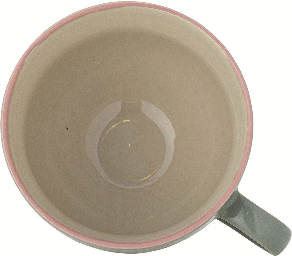 Kruset er fremstillet i robust stentøj, der sikrer både holdbarhed og en behagelig vægt i hånden. Den let udsvajede fod giver kruset et elegant udtryk, mens kanten med sit diskrete rosa skær tilføjer en blød og feminin dimension til designet. Den håndmalede dekoration er det, der virkelig gør Rosalynde-kruset særligt. Motiverne af fugle, blomster og blade er udført i blide nuancer, der harmonerer smukt med den grønne grundfarve og skaber en rolig, organisk æstetik.