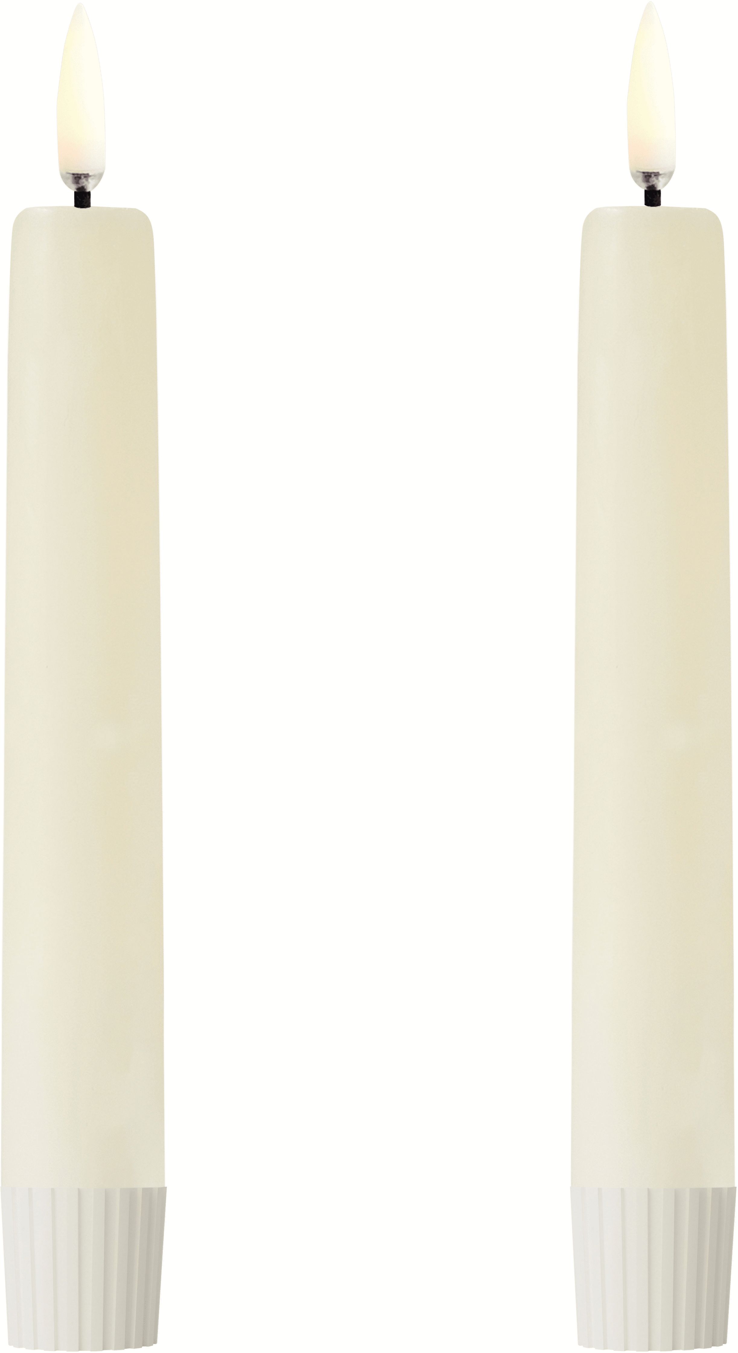 Uyuni Lighting præsenterer et sæt af to elegante LED kronelys i en tidløs ivory-nuance, der kombinerer traditionel æstetik med moderne teknologi. Disse kronelys er fremstillet i ren paraffin og giver det autentiske udseende af rigtige stearinlys, men uden risikoen for åben ild eller dryppende voks.Med deres slanke dimensioner på Ø2,3 cm og en højde på 16,4 cm passer disse kronelys perfekt i klassiske lysestager og skaber en stemningsfuld atmosfære i ethvert rum. Den avancerede LED-teknologi sikrer et varmt, flimrende lys, der efterligner et ægte stearinlys' naturlige bevægelse og giver en autentisk oplevelse.