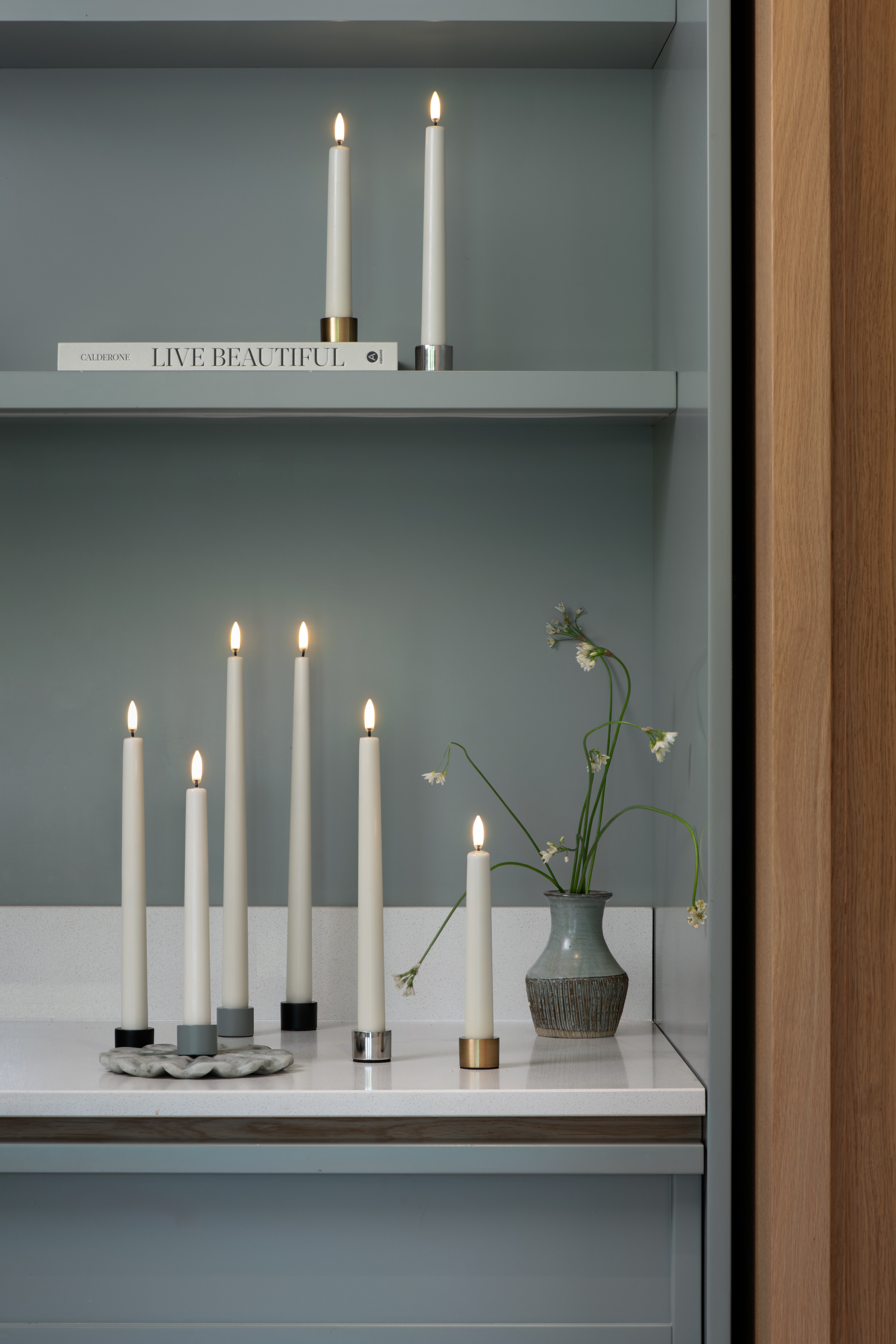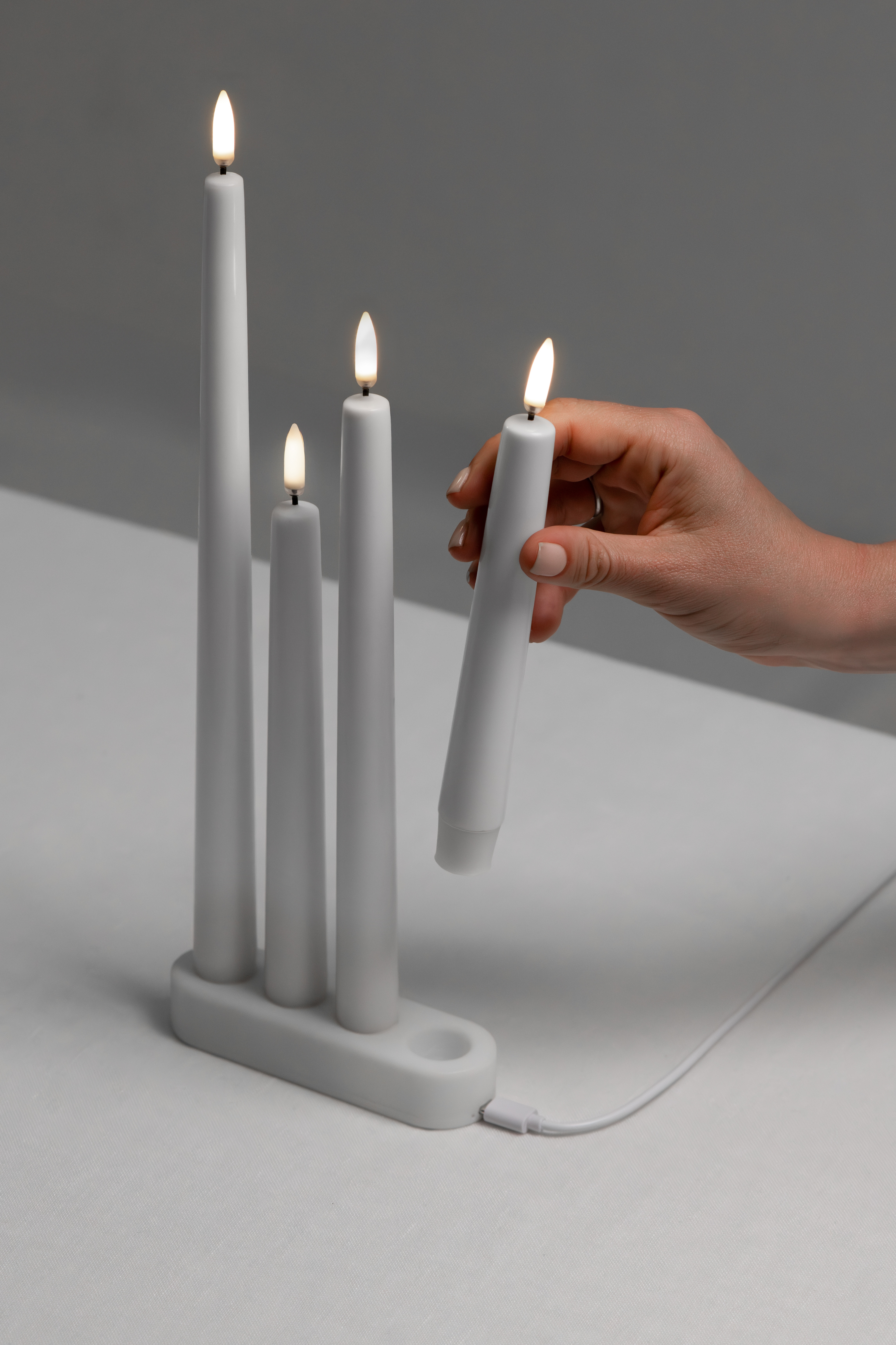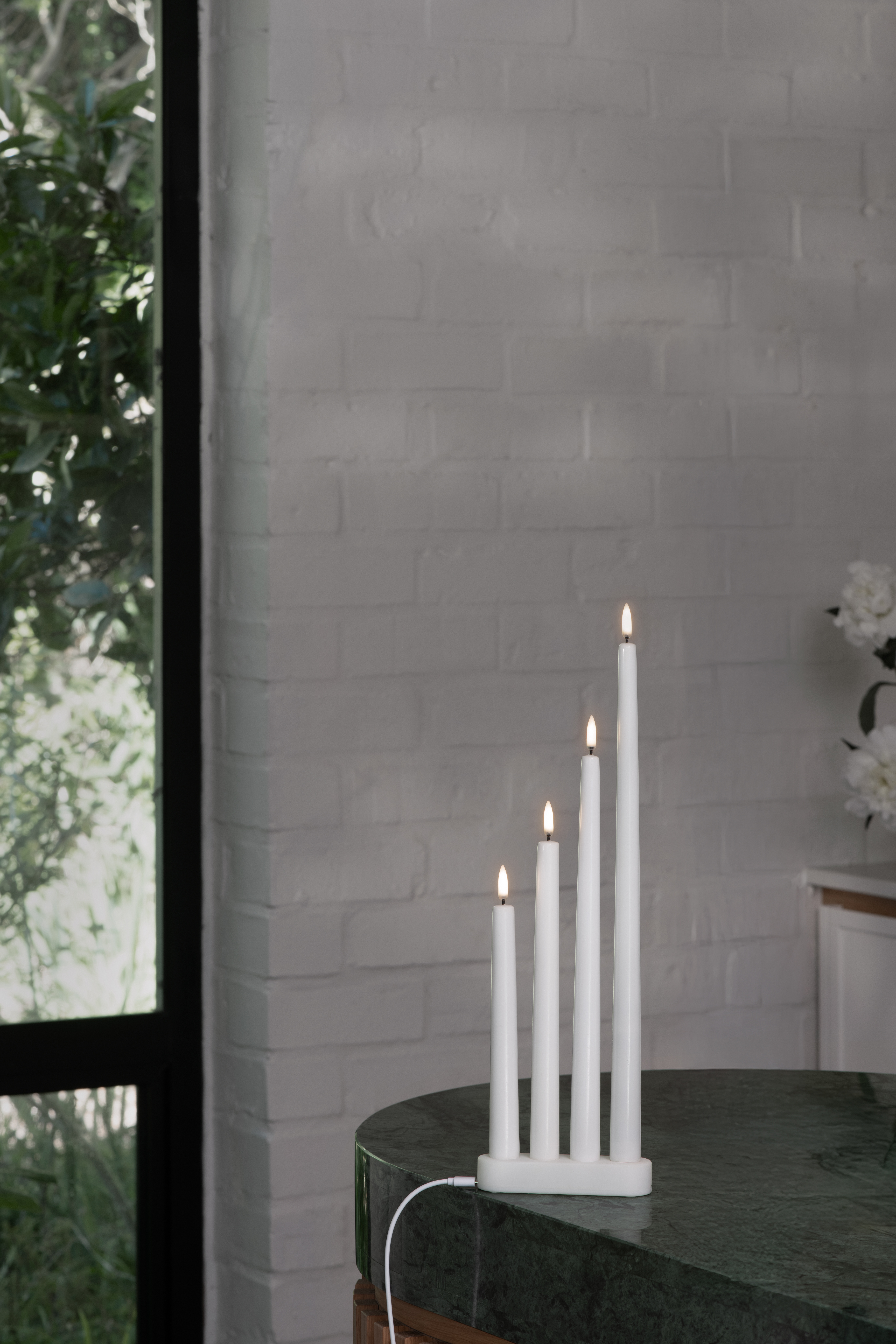 Uyuni Lighting bringer autentisk stemning ind i dit hjem med disse elegante kronelys i Nordic White. Med en højde på 25 cm og en diameter på 2,3 cm passer de perfekt til klassiske lysestager og skaber en naturlig atmosfære i ethvert rum. Lysene er fremstillet i ren paraffin, hvilket giver dem et autentisk udseende, der er næsten umuligt at skelne fra traditionelle stearinlys.Det innovative LED-design kombinerer det bedste fra to verdener: den varme, flimrende flamme fra et ægte lys og den sikkerhed og bekvemmelighed, som moderne teknologi tilbyder. Du kan trygt placere lysene overalt i hjemmet uden bekymring for åben ild, hvilket gør dem ideelle til familier med børn eller kæledyr. De er designet udelukkende til indendørs brug, hvor de skaber en indbydende atmosfære i stuen, på spisebordet eller i soveværelset.