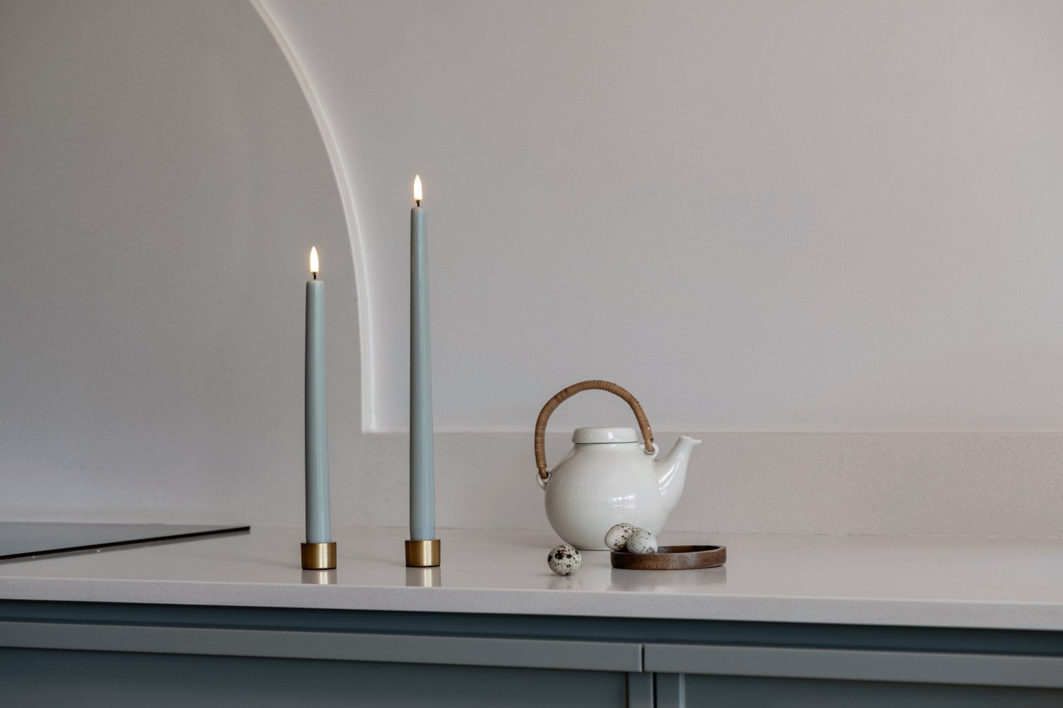 Uyuni Lighting bringer ægte hygge ind i hjemmet med disse elegante LED-kronelys i farven Dusty Green. Med deres slanke design og naturlige udseende skaber disse lys en autentisk stemning, der matcher både moderne og klassiske indretningsstile. Lysene er fremstillet i ren paraffin, hvilket giver dem et realistisk udseende, der næsten er umuligt at skelne fra traditionelle stearinlys.Disse kronelys kombinerer den klassiske æstetik med moderne teknologi. LED-teknologien sikrer, at lysene kan brænde i op til 400 timer på blot to AA-batterier, hvilket gør dem både praktiske og økonomiske i daglig brug. Du slipper for bekymringer om åben ild, dryppende voks eller sodrøg, mens du stadig nyder det bløde, levende lys, der skaber varme i ethvert rum.