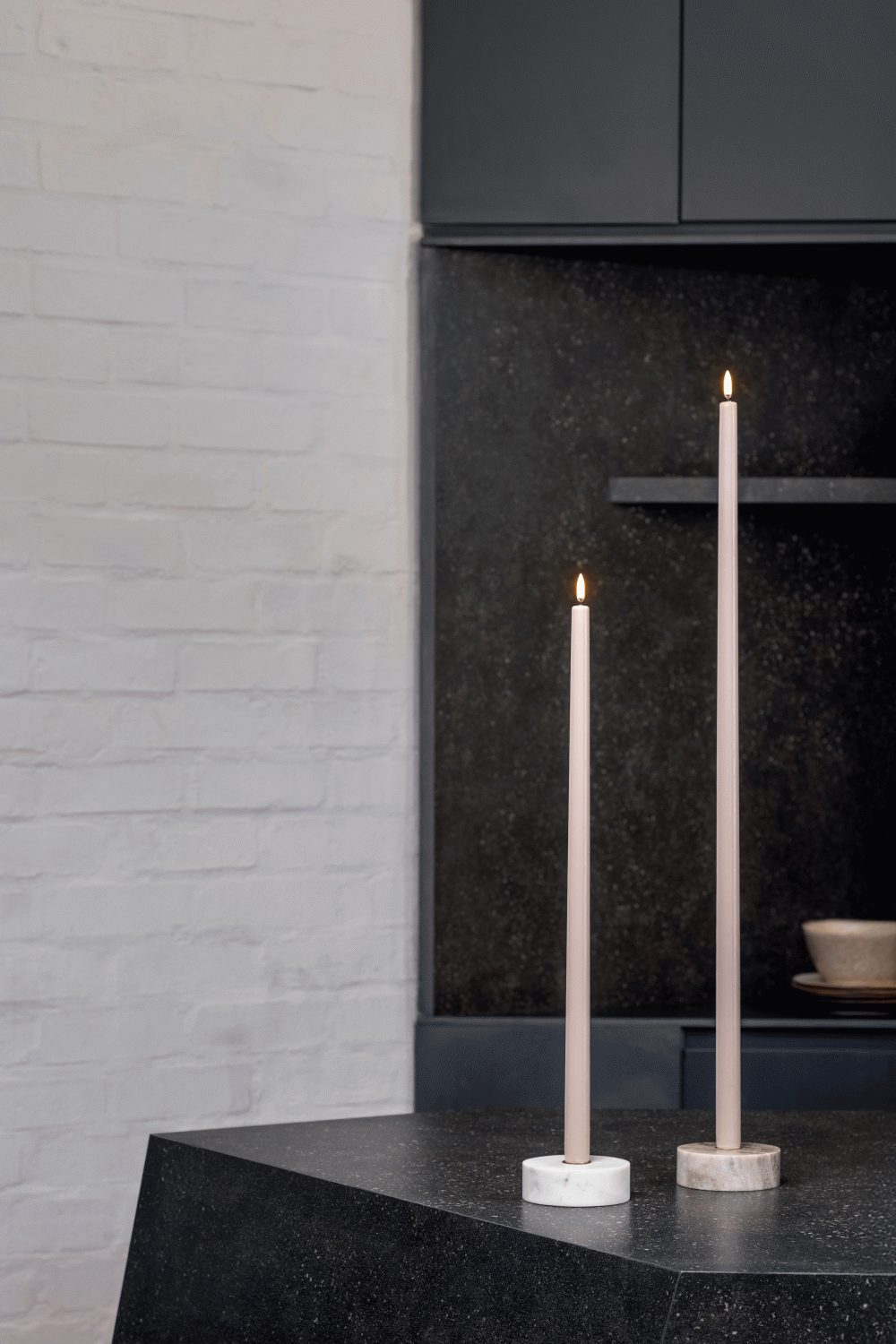 Lyset er fremstillet af ægte paraffinvoks med en glat, klassisk finish, der udstråler tidløs elegans. Den beige nuance passer smukt ind i skandinaviske farveskemaer og komplementerer naturlige materialer som træ og sten. Med sin markante højde fungerer det fantastisk som solitær dekoration eller kan kombineres med andre størrelser fra Uyuni Lightings kollektion for at skabe dynamiske arrangementer.