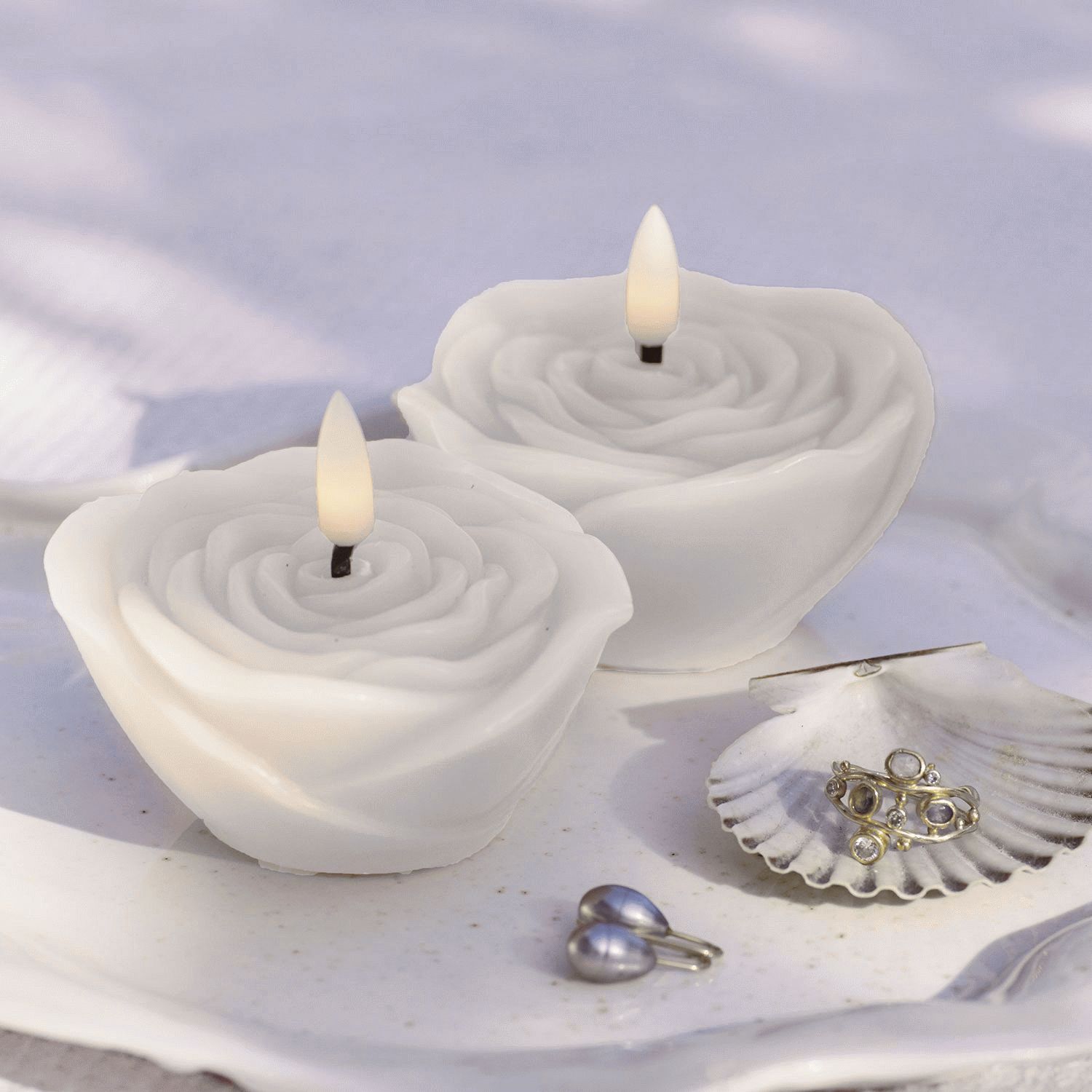 - Sæt med 2 LED-stearinlys i roseformet design