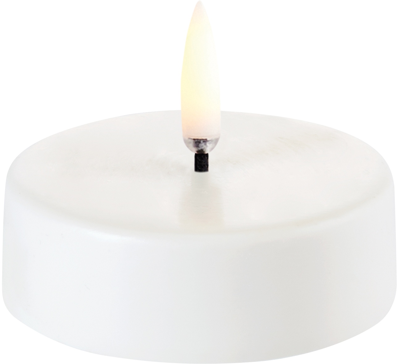 Uyuni Lighting bringer ægte stearinlyshygge ind i hjemmet helt uden åben ild med dette elegante LED-fyrfadslys i hvid. Det innovative design giver en autentisk lysoplevelse, hvor den patentanmeldte 3D Flame-teknologi skaber et naturligt flimrende lysskær, der er praktisk umuligt at skelne fra et ægte stearinlys. Med sin diskrete størrelse på Ø6,1 x H2,2 cm kan dette maxi-fyrfadslys enten stå som et enkelt, stemningsfuldt lyspunkt eller arrangeres i grupper for at skabe en indbydende atmosfære i ethvert rum.Dette LED-fyrfadslys forener det bedste fra to verdener - den æstetiske skønhed ved traditionelle stearinlys og den praktiske sikkerhed ved moderne LED-teknologi. Den indbyggede 6-timers timer sikrer, at lyset automatisk slukker efter brug, hvilket både sparer på batterierne og giver ro i sindet. Med en imponerende batterilevetid på hele 200 timer får du langvarig glæde af dit fyrfadslys, før det er nødvendigt at skifte de to AAA-batterier (som ikke medfølger).