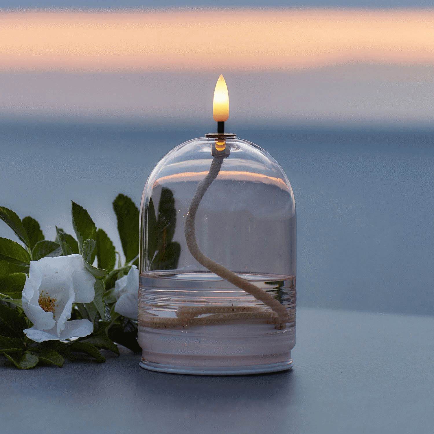 Lampens realistiske 3D LED flamme skaber en naturlig, pulserende lyseffekt, der giver en autentisk og hyggelig atmosfære uden åben ild. Den smarte olieimitation i silikone forstærker illusionen og giver lampen et ægte udtryk, mens den samtidig er fuldstændig sikker i brug. Dette gør Dea til et praktisk valg for familier med børn eller kæledyr, hvor traditionelle stearinlys eller olielamper kan udgøre en risiko.