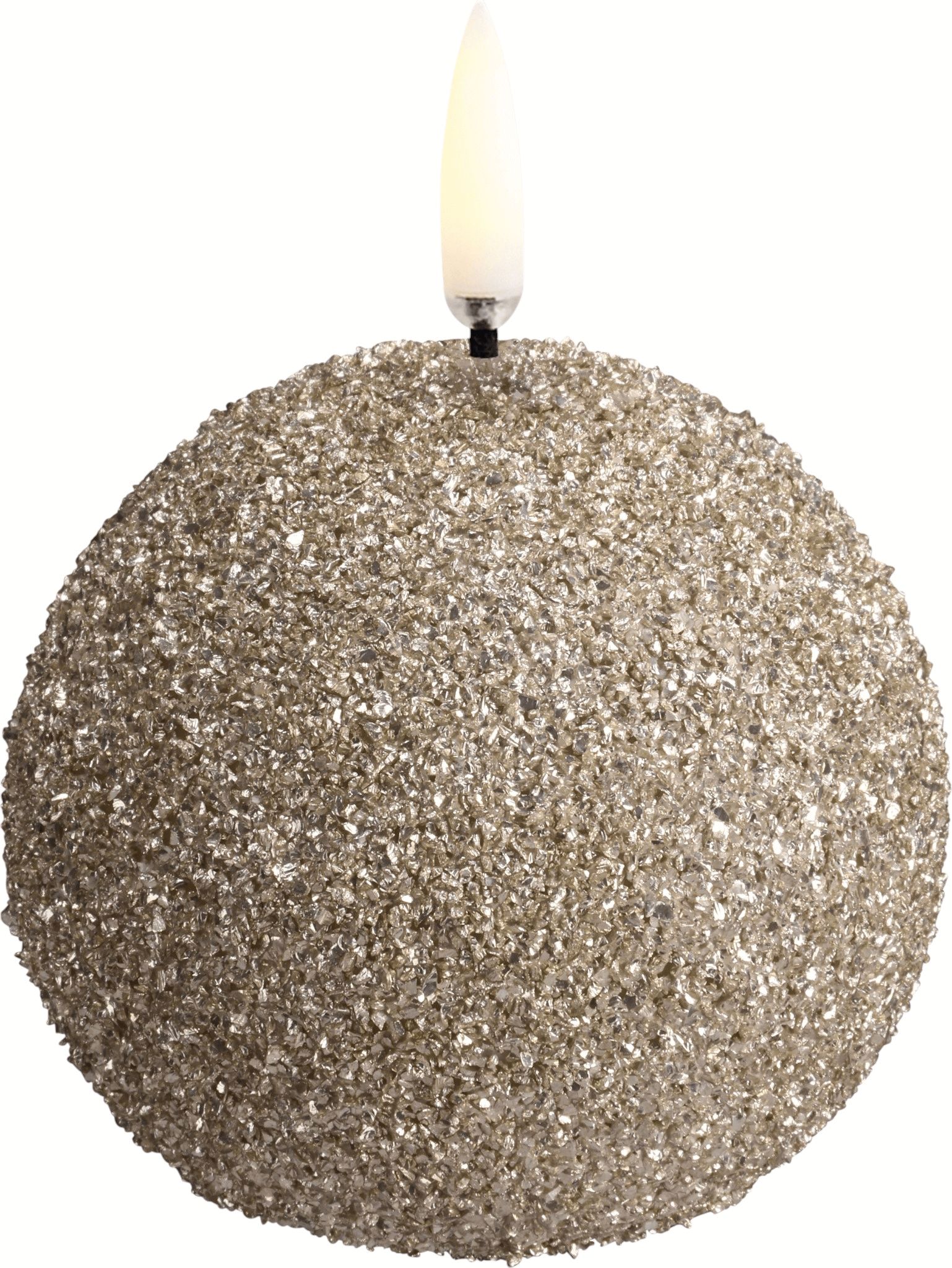 Uyuni Lightings Glitter Round Candle bringer festlig elegance ind i dit hjem med sin charmerende champagnefarve og glimrende overflade. Dette runde LED-lys i 7 cm diameter kombinerer den klassiske æstetik fra ægte paraffinvoks med moderne batteriteknologi, så du kan nyde det varme, flimrende lys uden bekymringer om åben ild.Den sofistikerede glitterfinish fanger og reflekterer lyset på en måde, der skaber en magisk atmosfære i enhver stue, soveværelse eller spisestue. Lyset er designet til indendørs brug og passer perfekt ind i både moderne og traditionelle indretningsstiler, hvor det tilføjer et touch af luksus og hygge.