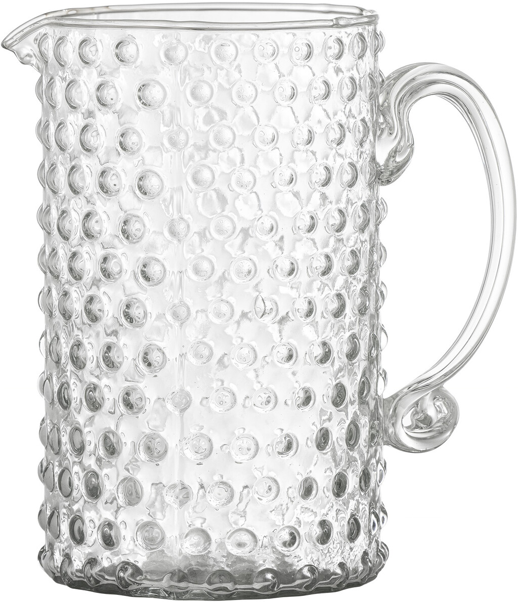 Tama Karaflen fra Bloomingville er en smuk mundblæst kande med prægede prikker. Karaflen er perfekt til vin og andre drikkevarer, blomsterbuketter eller bare som en dekorativ genstand. Luftbobler kan forekomme som en del af den naturlige arbejdsproces af det håndlavede produkt.Mål: L17xH18,5xB11 cm