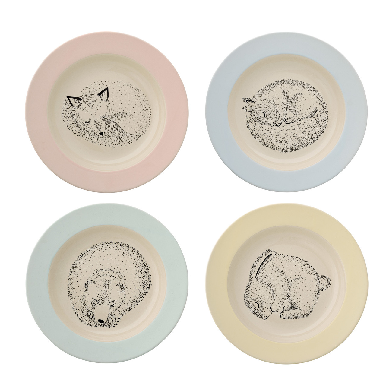 Bloomingville Adelynn stentøjs suppetallerkener er fire forskellige børnetallerkner med fine dyre motiv. Adelynn er en hel serie af fint børnestel i stentøj, som kan sammensættes efter behøv. Både tallerkner og kopper er i fine pastelfarver med dyremotiv og er den perfekte dåbsgave eller oplagt til en større børneflok hvor hvert barn har en farve eller dyr.Adelynn stellet er også fint til sommerhuset eller kolonihaven og kan kombineret med flere af Bloomingvilles stel.
