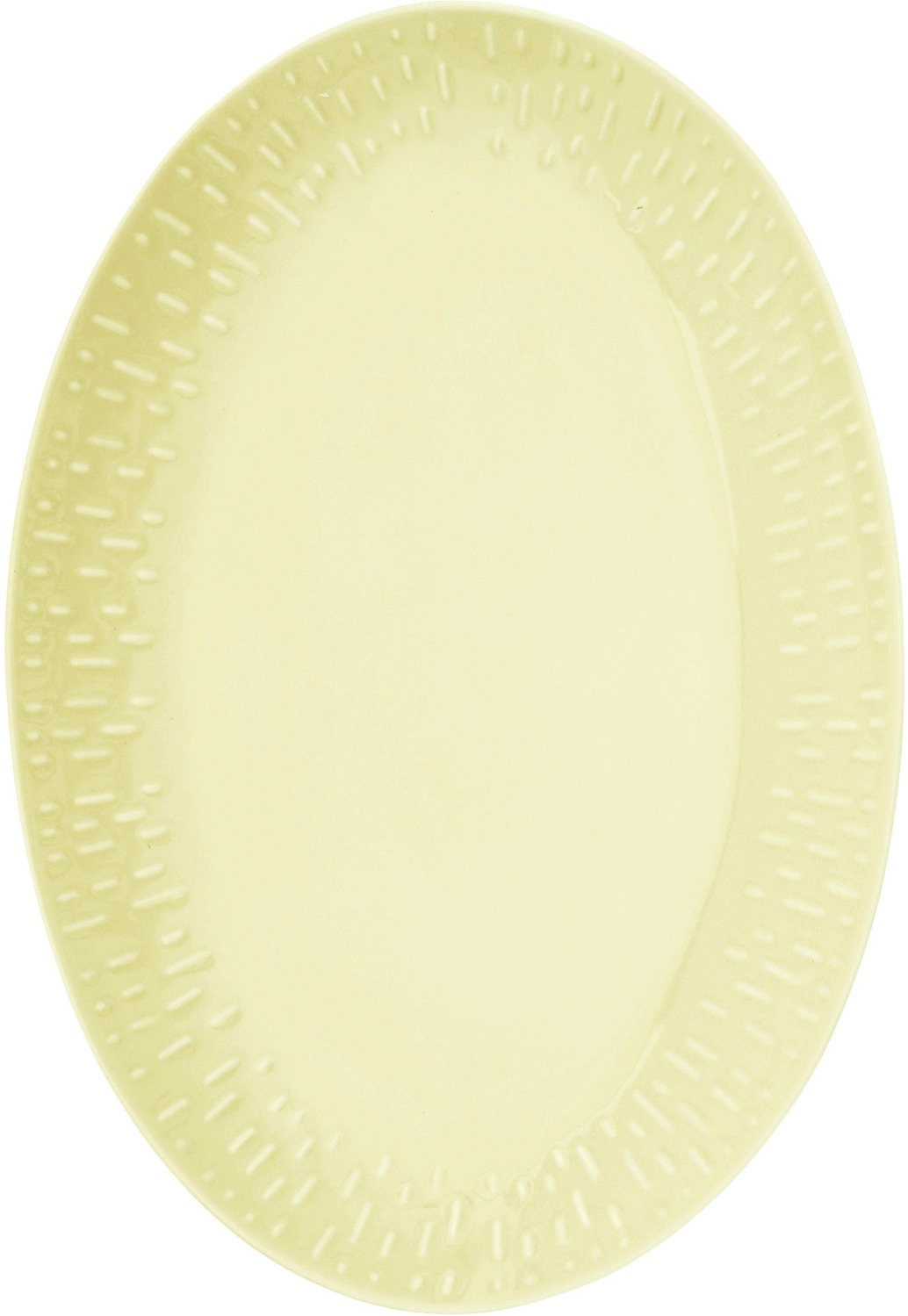 Dette elegante ovale serveringsfad fra aida's Confetti-serie bringer glæde og farve til enhver anretning. Det gule porcelænsfad er designet med en perfekt størrelse til servering af både hverdagsmad og festlige retter, og dets tidløse form gør det til et alsidigt element i din borddækning.Confetti-serien er en del af aida's LIFE IN COLOUR univers, der handler om at tilføje personlighed og kulør til hverdagen. Serveringsfadet er dekoreret med et karakteristisk relief langs kanten, hvor det tilfældige mønster skaber et levende spil i den farverige glasur. Dette designelement giver fadet en unik karakter og gør hvert enkelt stykke særligt.