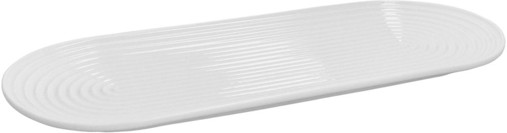 - Ovalt serveringsfad i hvidt porcelæn med karakteristiske rytmiske riller