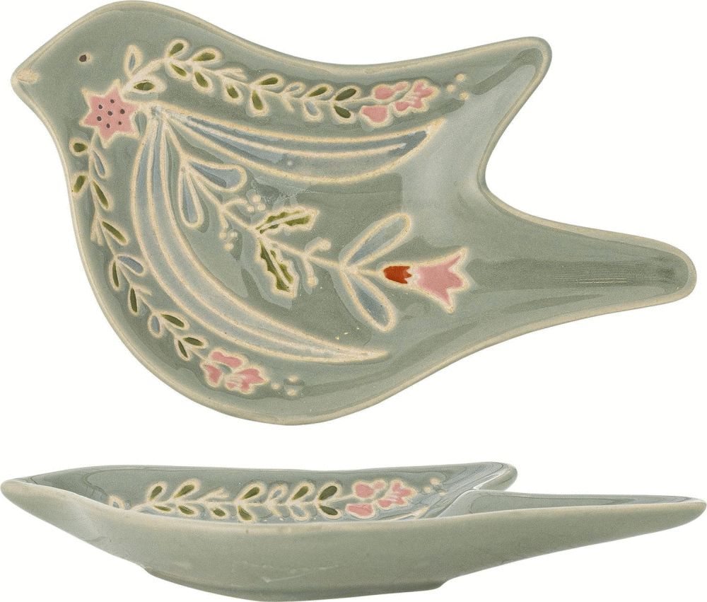 - Håndmalet serveringsfad i stentøj formet som en fugl